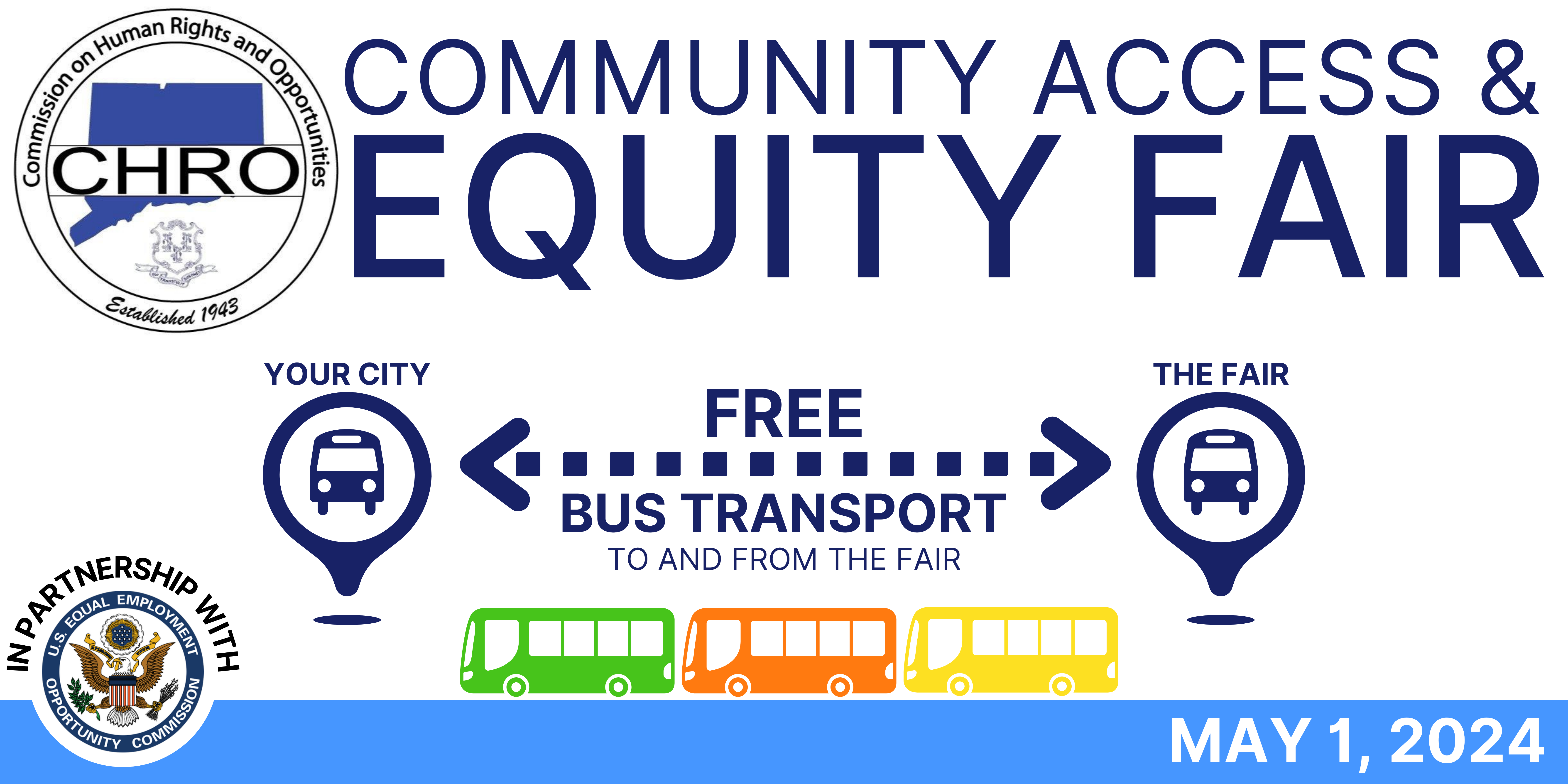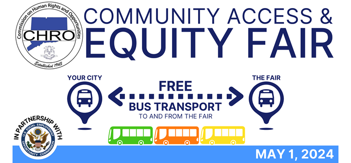 The CHRO will be hosting its Community Access and Equity Fair on May 1, 2024 at the Connecticut State Armory at 360 Broad Street, in Hartford, CT. To facilitate participation by all communities, including underserved communities, the CHRO will be providing free bus transportation to and from the Access Fair, available in select cities. See below further information. Register today for a seat by clicking the stop below, and then click here to register to attend the fair today!