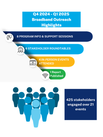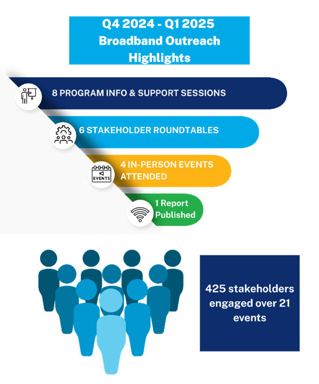 DEEP's Office of Telecommunications and Broadband continued outreach and engagement efforts hosting a total of 21 events, directly connecting with 425 stakeholders to drive awareness and program participation with quarterly roundtables for Internet Service Providers; State, Tribal, and Local Governments; and Community Organizations in collaboration with DAS's Commission for Educational Technology and the Connecticut Education Network. We published the 2024 Connecticut Broadband Report, highlighting Connecticut’s progress in closing the digital divide through strategic interagency collaboration and targeted initiatives and providing a comprehensive evaluation of advancements and ongoing challenges in achieving universal broadband access and adoption. We launched a new easy to use survey for property owners, managers and tenants to help fast-track eligibility for multi-family homes that need better broadband wiring through the ConneCTed Communities Grant Program.