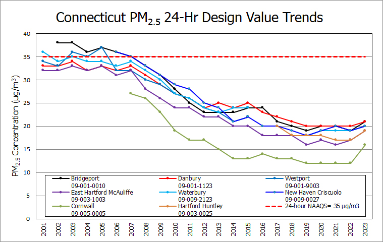 Below is the trend of Connecticut’s 24-hour design values and the NAAQS of 35 µg/m3. The 24-hour average is defined as the three-year average of the 98th percentile of the 24-hour samples (40 CFR Part 50 Appendix N). All monitors are also currently meeting the 24-hour PM2.5 NAAQS.
