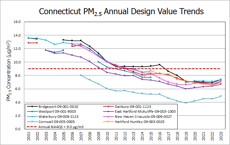 The above graph displays Connecticut’s trend of the annual PM2.5 design values and the National Ambient Air Quality Standard (NAAQS) of 9.0 µg/m3. The annual design value for each monitor is calculated by taking the three-year average annual mean concentration (40 CFR Part 50 Appendix N). All monitors are currently meeting the annual PM2.5 NAAQS.