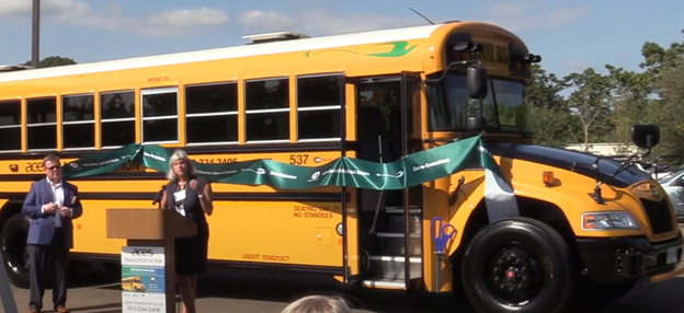 - In 2020, Area Cooperative Education Services (ACES) received $213,750.00 toward the replacement of a Class 5 school bus with an electric MY 2020 equivalent, EVSE included (Story and video of ACES electric school bus CT’s First 71-Seat Electric School Bus Hits The Road – NBC Connecticut , see photo titled ACESElectricSchoolBus).