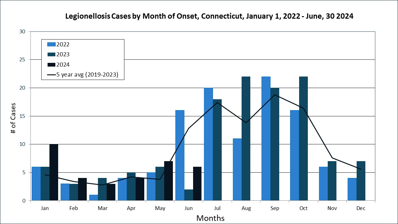 The Connecticut Department of Public Health (CT DPH) began routine legionellosis surveillance in 1997. Since then, annually reported cases have ranged from 15-201. An upward trend in recent years shows monthly and seasonal variation as seen in the figure below. The CT DPH uses the national surveillance case definition to determine case status. Legionellosis is reportable to the CT DPH by physicians and laboratories, and to the patient’s local health department. To identify possible common sources of exposure, staff of the CT DPH Epidemiology and Emerging Infections Program conduct follow-up on all confirmed legionellosis cases by contacting the healthcare provider of record, and conducting patient interviews.