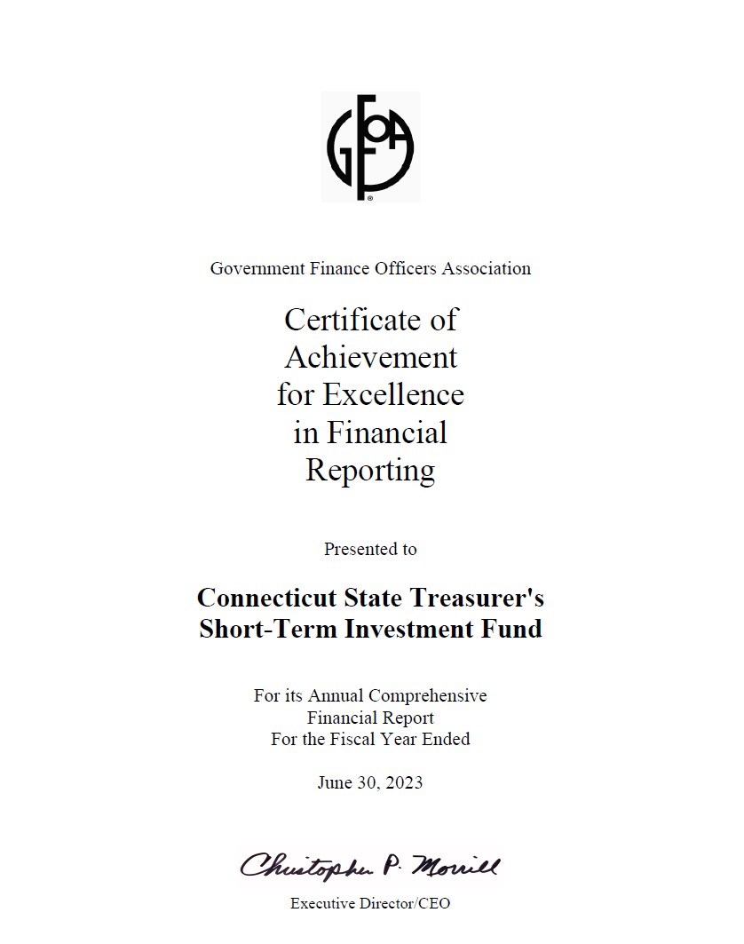 - STIF’s Comprehensive Annual Financial Report was awarded the Certificate of Achievement for Excellence in Financial Reporting for 2022 by the Government Finance Officers Association. See below.