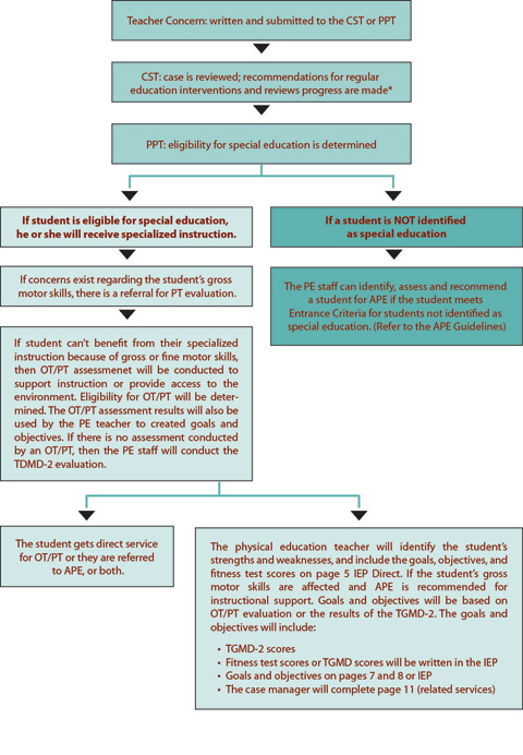 Students who exhibit problems with motor performance, physical mobility, and functional independence that interfere with their ability to participate in and benefit from their educational programs should receive APE. Students with unique learning needs are often referred to occupational therapy, physical therapy, and therapeutic recreation for individualized programs. While these service providers share many commonalities in their roles and concerns, they are not interchangeable, and may be provided to children with disabilities at the specific recommendation of the Planning and Placement Team (PPT)