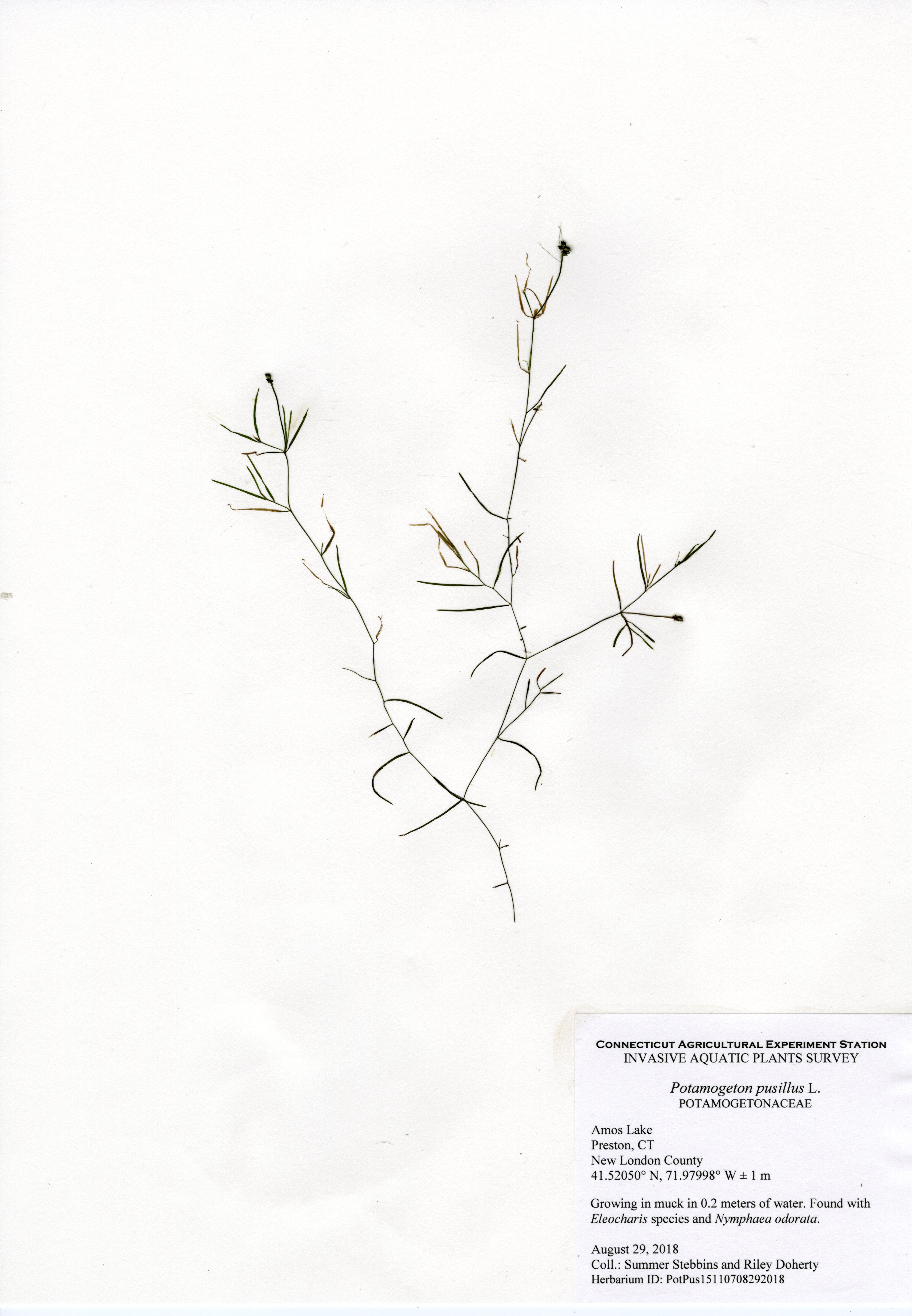 The 2018 vegetative survey of Amos Lake was the third survey performed by CAES IAPP of the waterbody; it was previously surveyed in 2006 and 2013. Similar to previous surveys, variable-leaf watermilfoil (Myriophyllum heterophyllum) was the only invasive found in the lake. It has spread in abundance from a few locations on the western perimeter of the lake to more of the western perimeter as well as a cove on the eastern side. Mudmat (Glossostigma cleistanthum) is also a non-native plant found in the lake, but it is not considered a state-listed invasive species and is rarely a nuisance. Common reed (Phragmites australis), an invasive wetland plant, was found along the northern shoreline of the lake. As found in 2013, Robbins’ pondweed (Potamogeton robbinsii) was the most common plant. It covers almost the entire perimeter of the lake. Overall presence of vegetation increased in 2018 from previous years with dense populations of plants in the coves along the east and west shorelines of the lake. Species richness, however, decreased from 29 in 2013 to 22 species.
