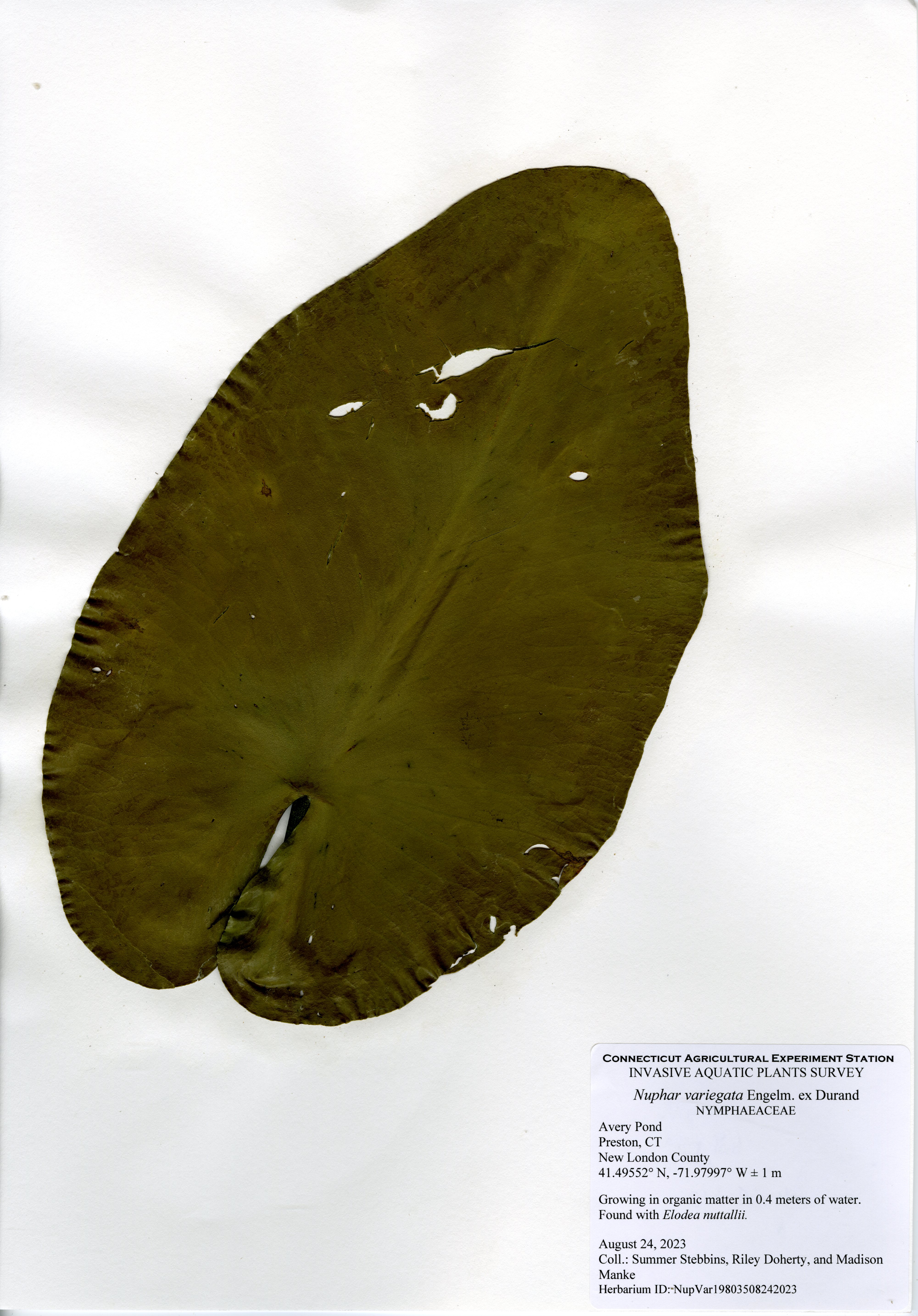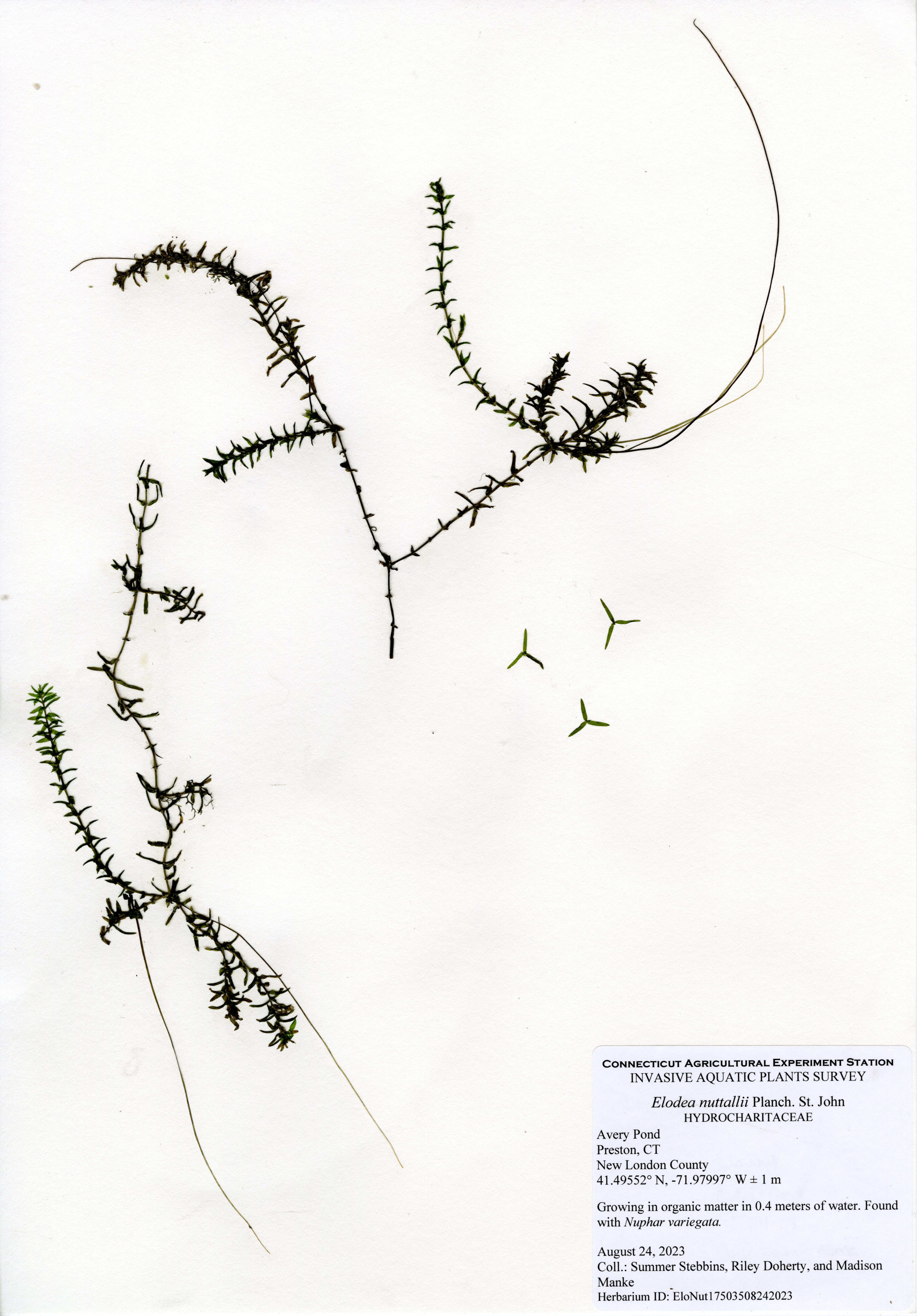In 2023, CAES OAIS found northern hydrilla (Hydrilla verticillata ssp. lithuanica) in Amos Lake, which triggered concern that it could also be in nearby waterbodies. A member of the public found what they thought was northern hydrilla in Avery Pond, so CAES OAIS conducted a vegetation survey of the pond. Fortunately, the plant in question was native western waterweed (Elodea nuttallii), a hydrilla look alike.