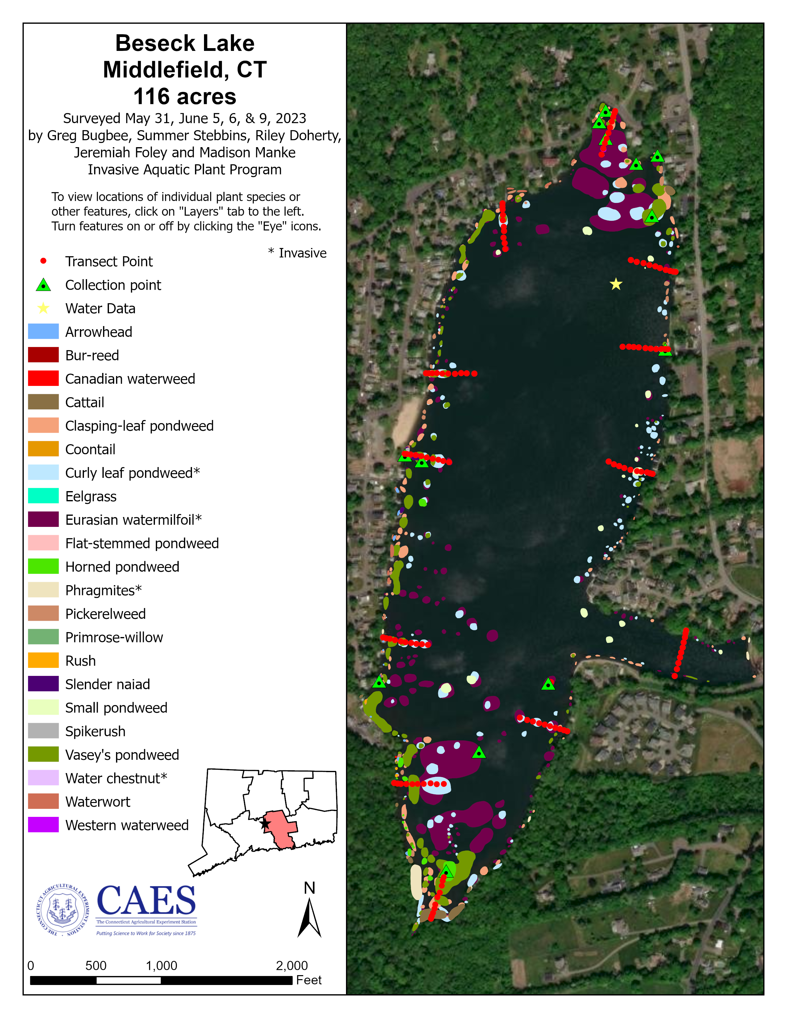 Beseck Lake is a 113-acre lake located in Middlefield, CT. There is a public boat launch along the eastern shoreline. The lake is used for a variety of recreational activities such as boating, water skiing, jet skiing, swimming, and fishing. There is a private town beach on the western side of the lake open to town residents. A dam is located at the end of the long, deep cove along the eastern shore. Most of the shoreline is developed except for a park at the southern end. Beseck Lake's maximum depth is 24 feet with an average depth of 12 feet. This is the fourth survey that CAES OAIS has completed of Beseck Lake.