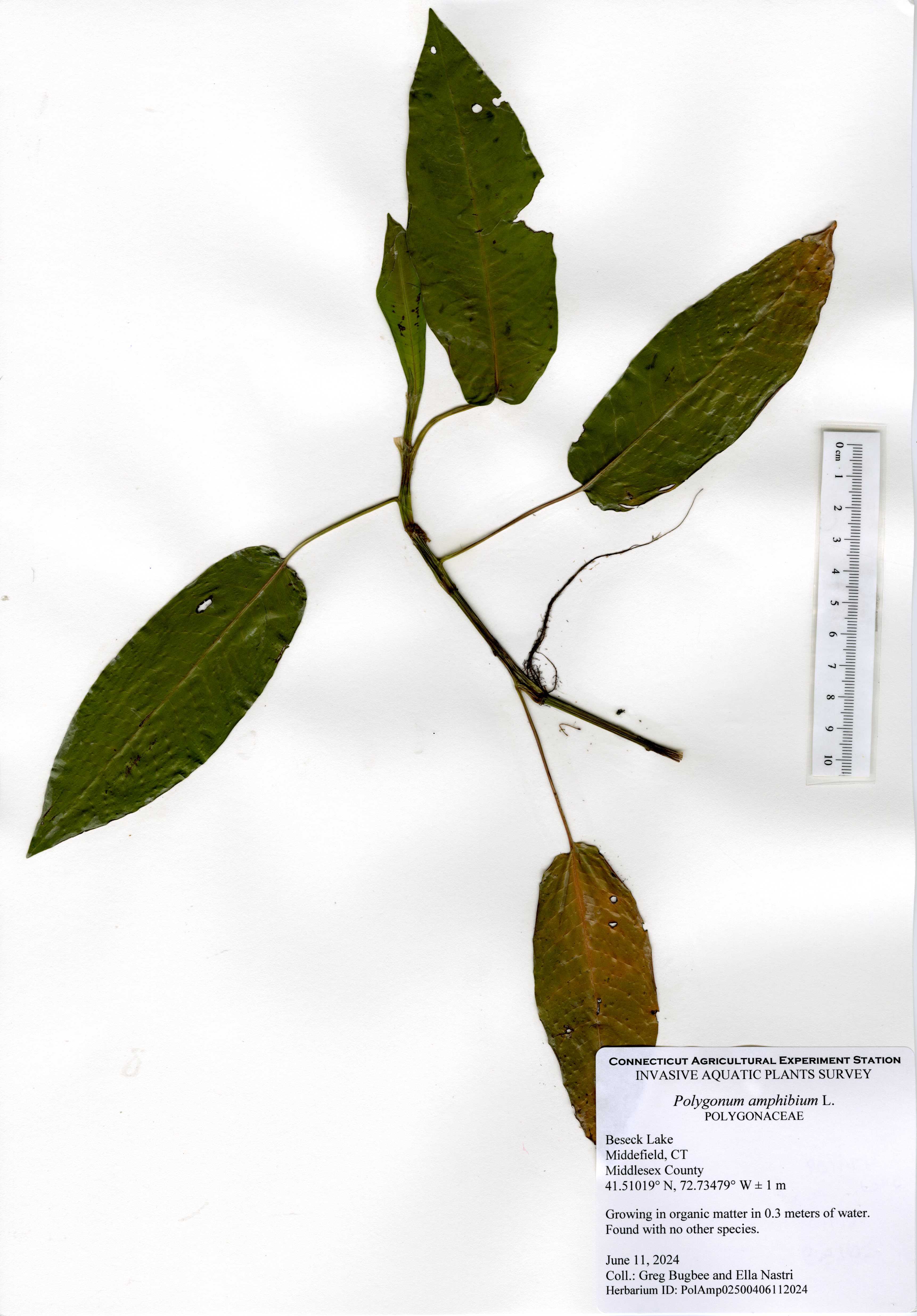 A total of 17 species were found in the 2024 survey. All invasive plants found in 2024 were found again except for water chestnut (Trapa natans) which was hand pulled by CAES OAIS in 2023. Eurasian watermilfoil (Myriophyllum spicatum) was only found in one small patch on the western side of the lake not far from the shore. Curlyleaf pondweed (Potamogeton crispus) was found in a few small patches throughout the lake mostly on the western side. Phragmites (Phragmites australis) was still found at the southernmost end of the lake and close to the dam on the eastern side of the lake relative to 2023. All invasive species coverage has significantly decreased since 2023 with very few patches of Eurasian watermilfoil and curlyleaf pondweed.