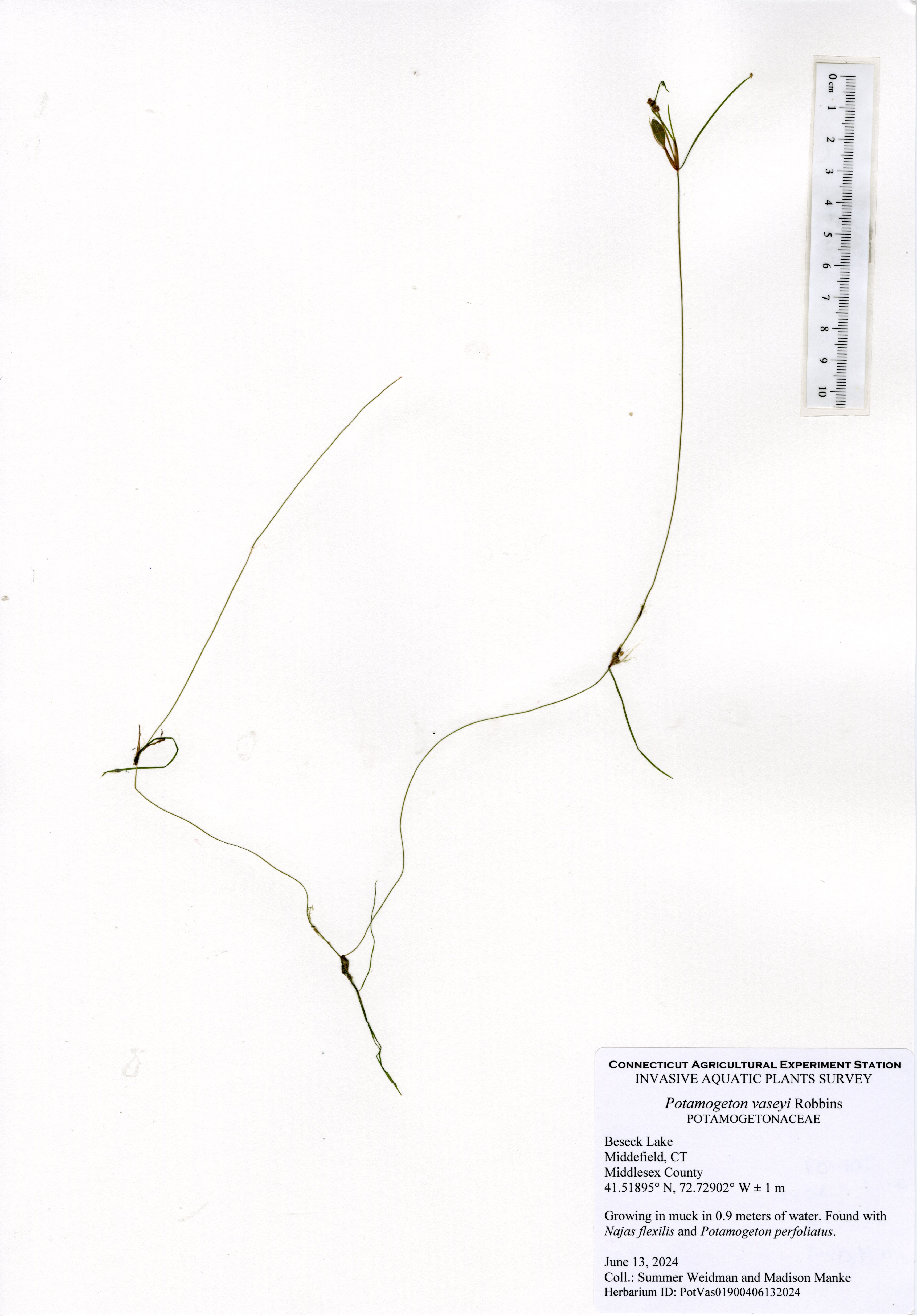 This was our third survey that confirmed the presence of state-listed Vasey’s pondweed (Potamogeton vaseyi). Vasey’s pondweed was found relatively consistently throughout the whole lake predominately on the western side of the lake in large patches and appeared to grow closely with clasping leaf pondweed (Potamogeton perfoliatus) at the northern end of the lake.