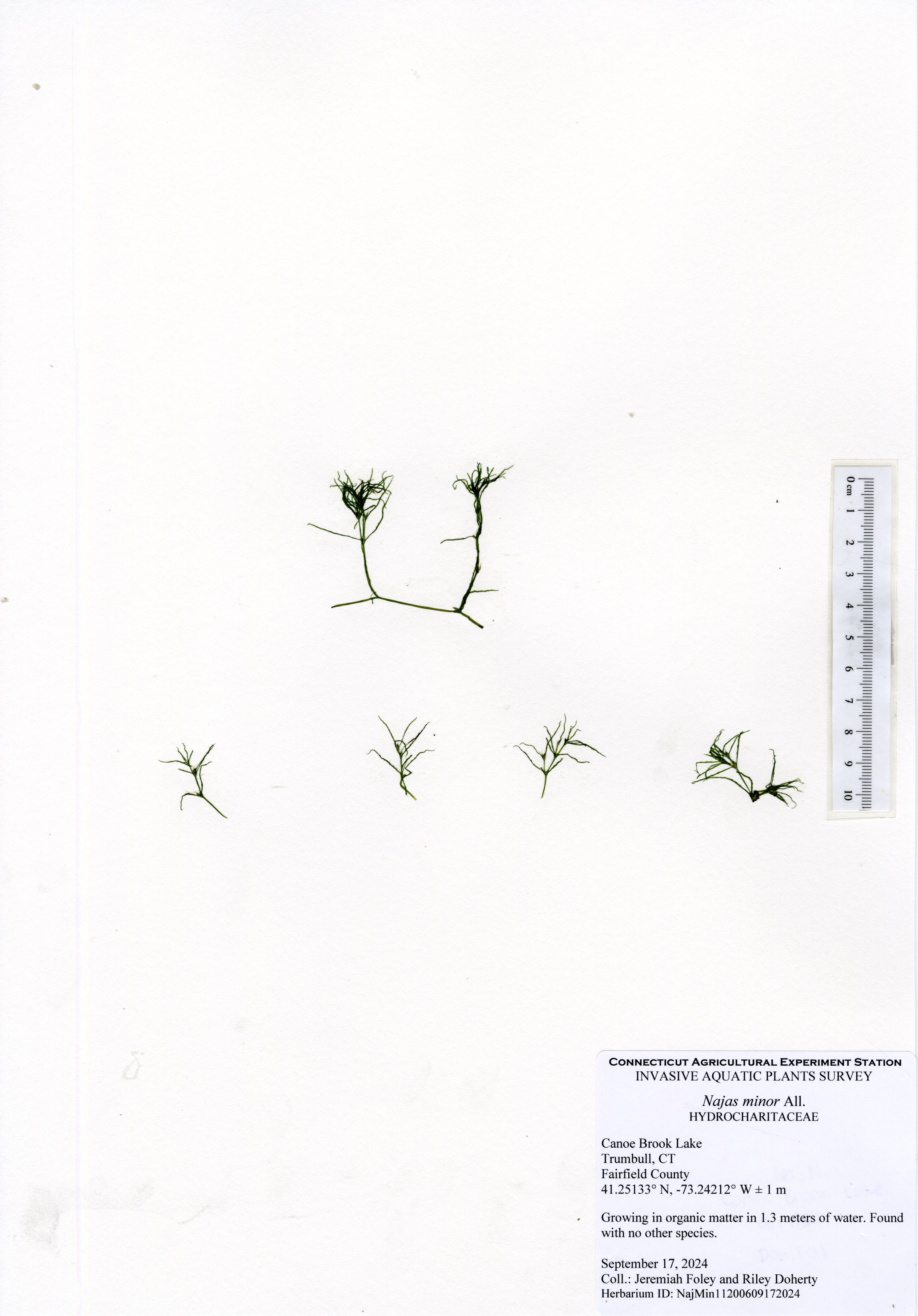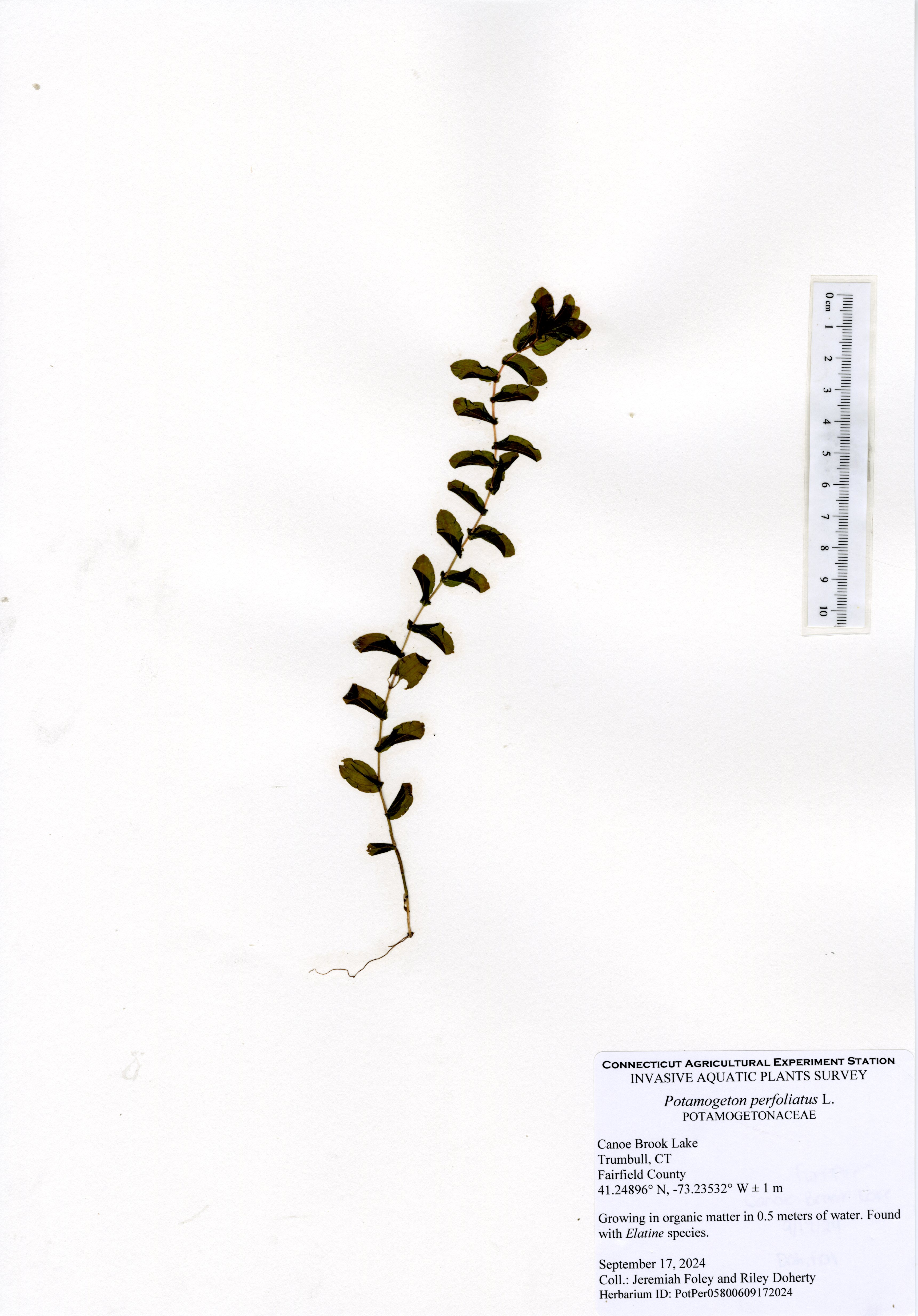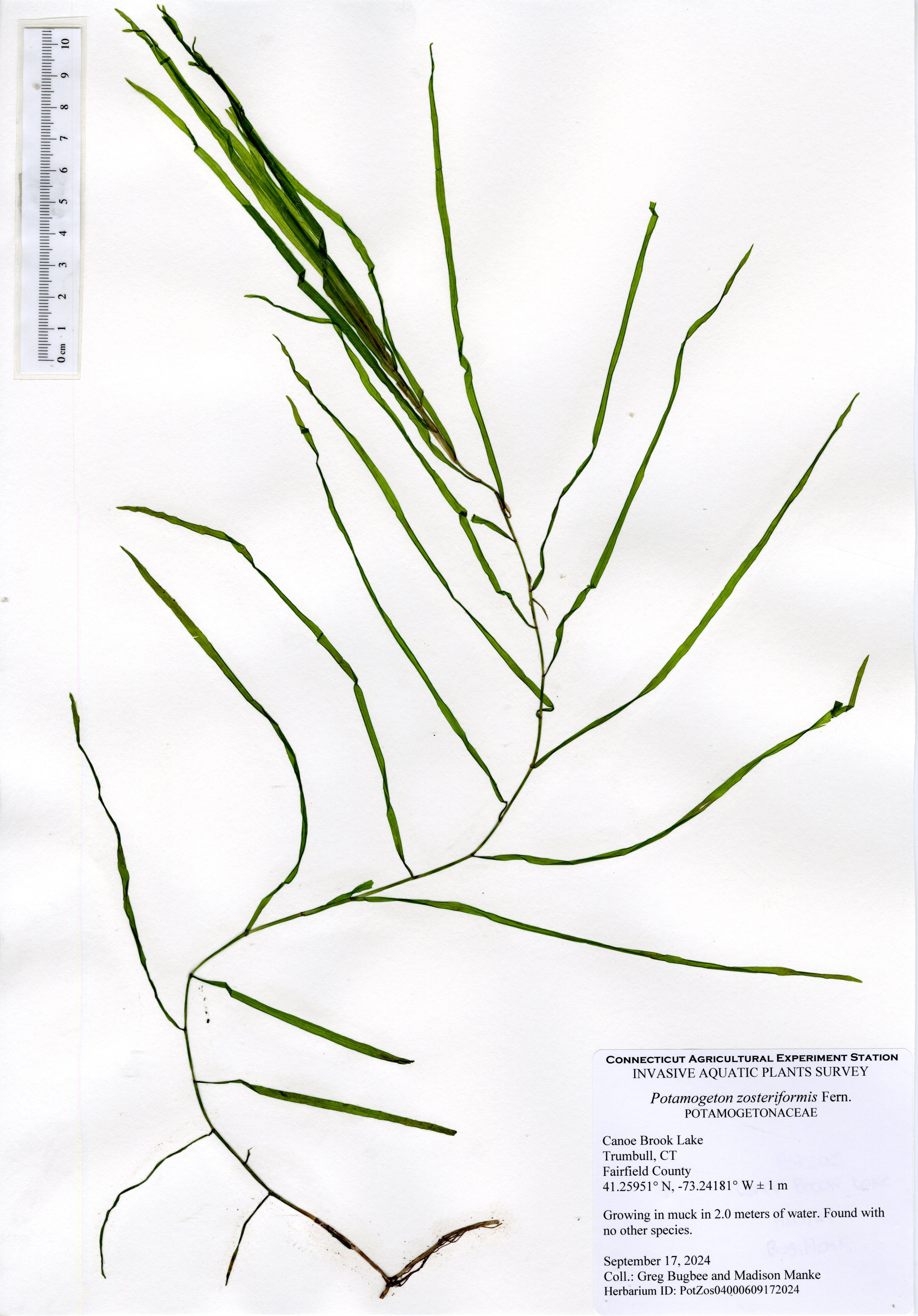 Clasping-leaf pondweed (Potamogeton perfoliatus) was the most common species in the lake and was found throughout the littoral zone. Eelgrass (Vallisneria americana) was the next most common species occuring in intermittent sparse patches. Cattail (Typha species), a native semi-aquatic wetland species, was found in many areas along the shore. All other native species had small populations in different areas of the lake. The northern most cove had eight different native species, including arrowhead (Sagittaria species), Berchtold’s pondweed (Potamogeton berchtoldii), clasping-leaf pondweed, common duckweed (Lemna minor), eelgrass, flat-stemmed pondweed (Potamogeton zosteriformis), variable pondweed (Potamogeton gramineus), and water starwort (Callitriche species). The northern cove appears to be shallowing due to sedimentation from the inlet stream and leave accumulation. Deeper areas of the lake had occasional spots of eelgrass and clasping-leaf pondweed as well as charaphyte, a plant-like freshwater algae. Water transparency was 1.8 meters (6 ft) which is below average for Connecticut lakes and represents a decline from earlier surveys.