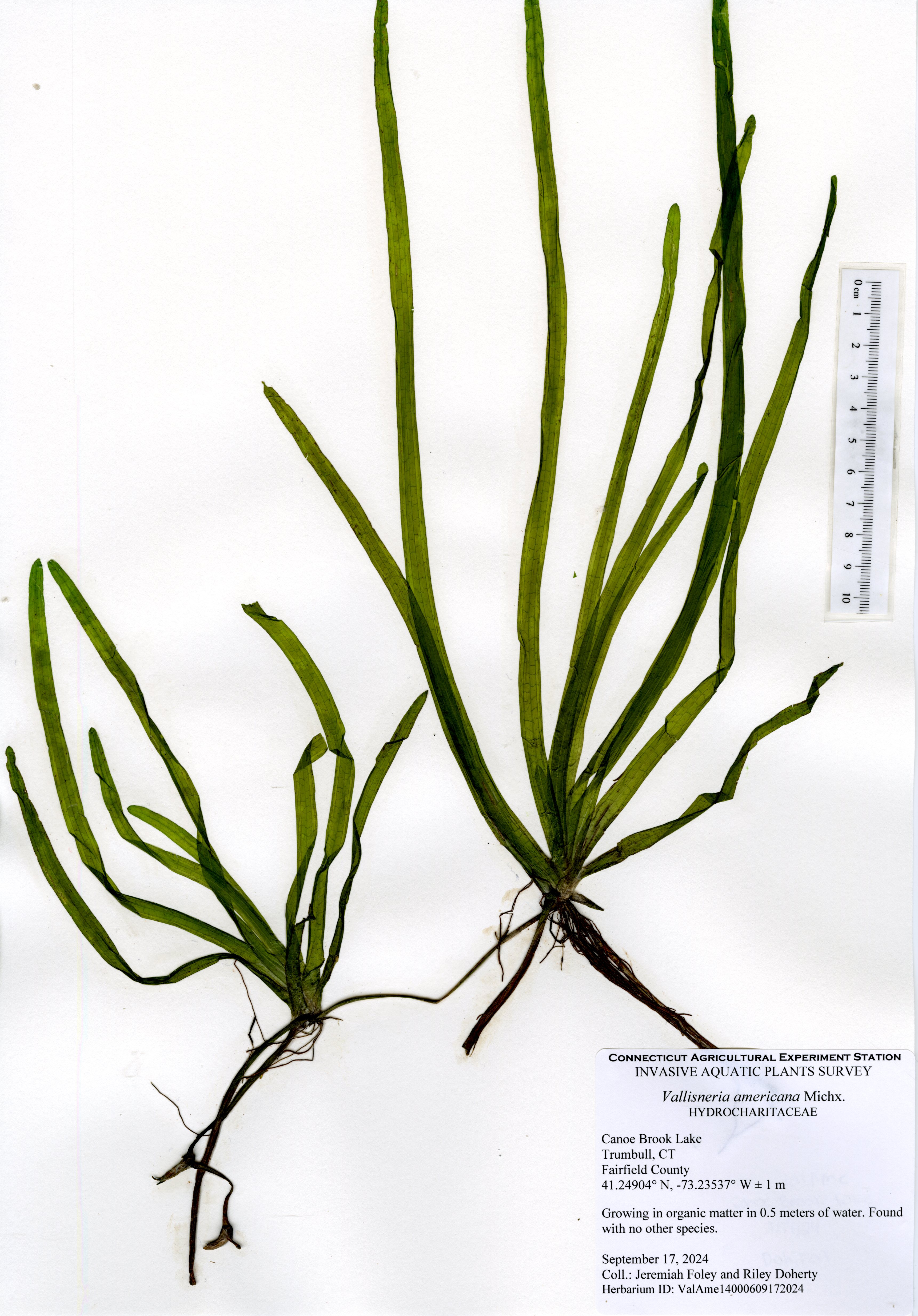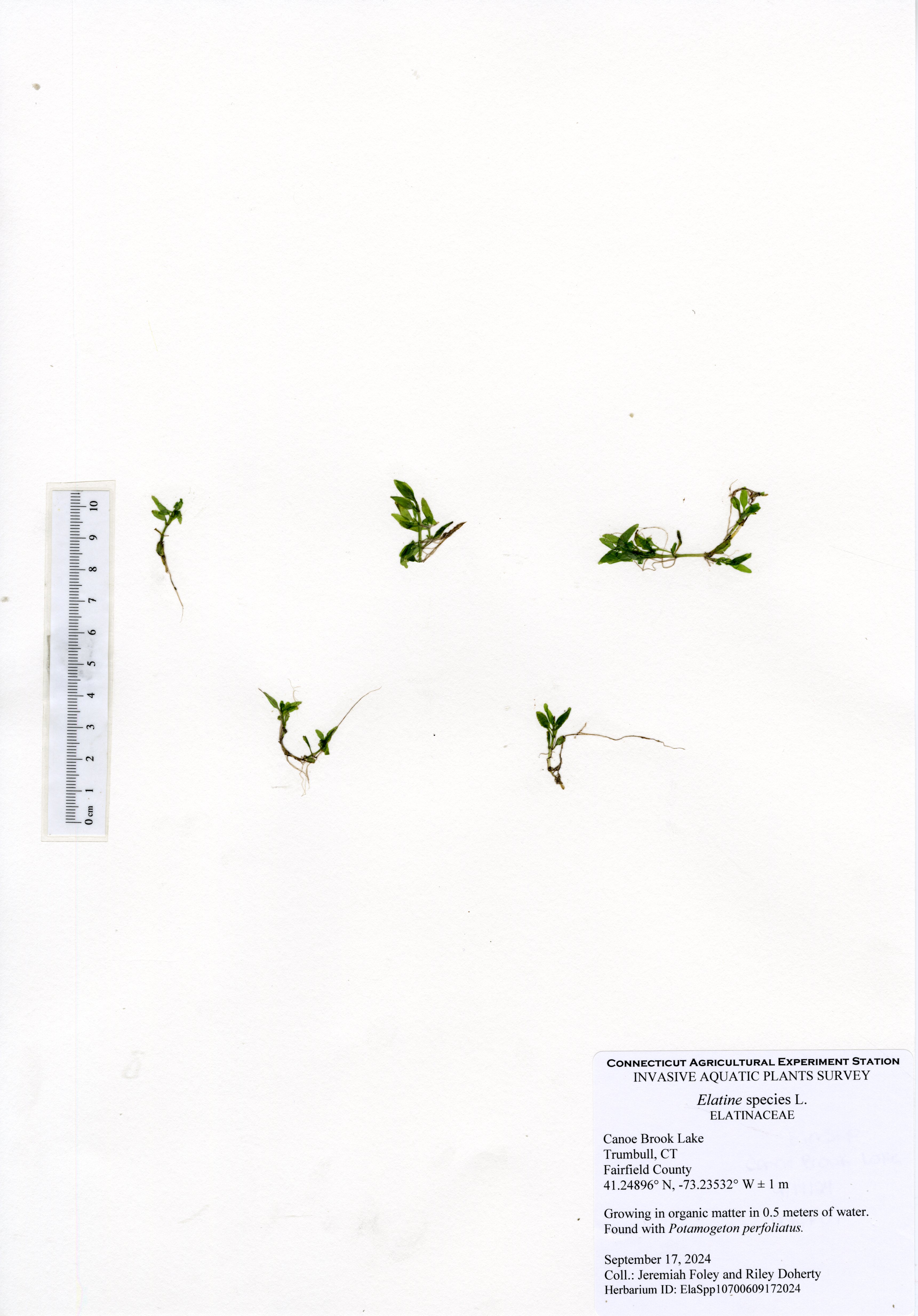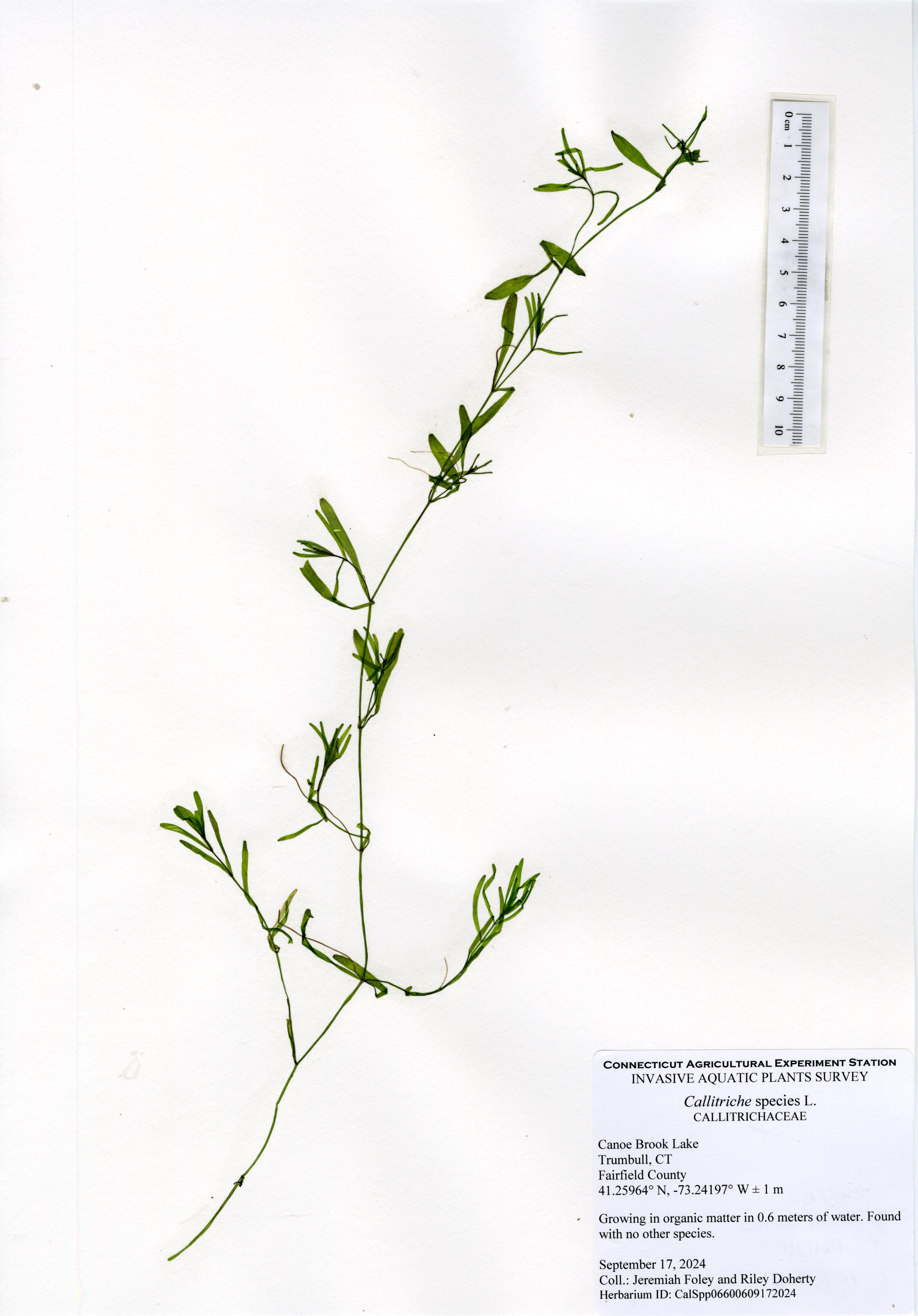 Clasping-leaf pondweed (Potamogeton perfoliatus) was the most common species in the lake and was found throughout the littoral zone. Eelgrass (Vallisneria americana) was the next most common species occuring in intermittent sparse patches. Cattail (Typha species), a native semi-aquatic wetland species, was found in many areas along the shore. All other native species had small populations in different areas of the lake. The northern most cove had eight different native species, including arrowhead (Sagittaria species), Berchtold’s pondweed (Potamogeton berchtoldii), clasping-leaf pondweed, common duckweed (Lemna minor), eelgrass, flat-stemmed pondweed (Potamogeton zosteriformis), variable pondweed (Potamogeton gramineus), and water starwort (Callitriche species). The northern cove appears to be shallowing due to sedimentation from the inlet stream and leave accumulation. Deeper areas of the lake had occasional spots of eelgrass and clasping-leaf pondweed as well as charaphyte, a plant-like freshwater algae. Water transparency was 1.8 meters (6 ft) which is below average for Connecticut lakes and represents a decline from earlier surveys.