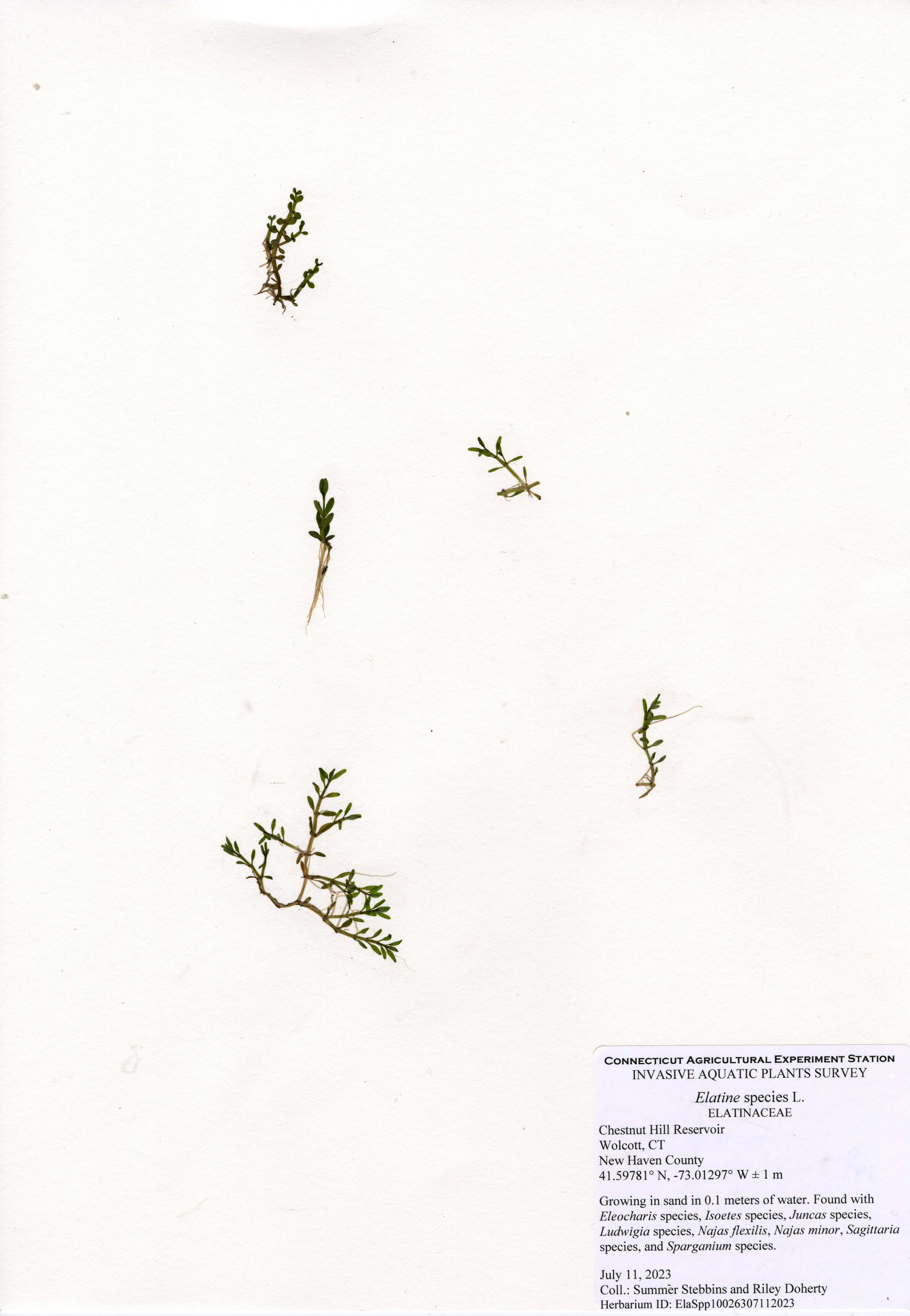 The center of Chestnut Hill Reservoir is too deep to support plants, but plants were present throughout the majority of areas shallow enough to support plants. Fourteen native species were found in the reservoir. Eelgrass (Vallisneria americana) and Berchtold’s pondweed (Potamogeton berchtoldii) were the most common plants and found throughout the shallow areas. Cattails (Typha species) and rush (Juncus species) are native wetland species. Arrowhead (Sagittaria species), bur-reed (Sparganium species), quillwort (Isoetes species), primrose-willow (Ludwigia species), spikerush (Eleocharis species), and waterwort (Elatine species) are low-growing native species found in very shallow waters near the shoreline. Ribbon-leaf pondweed (Potamogeton epihydrus), snailseed pondweed (Potamogeton bicupulatus), and western waterweed (Elodea nuttallii) were found near transects 1 and 5.
