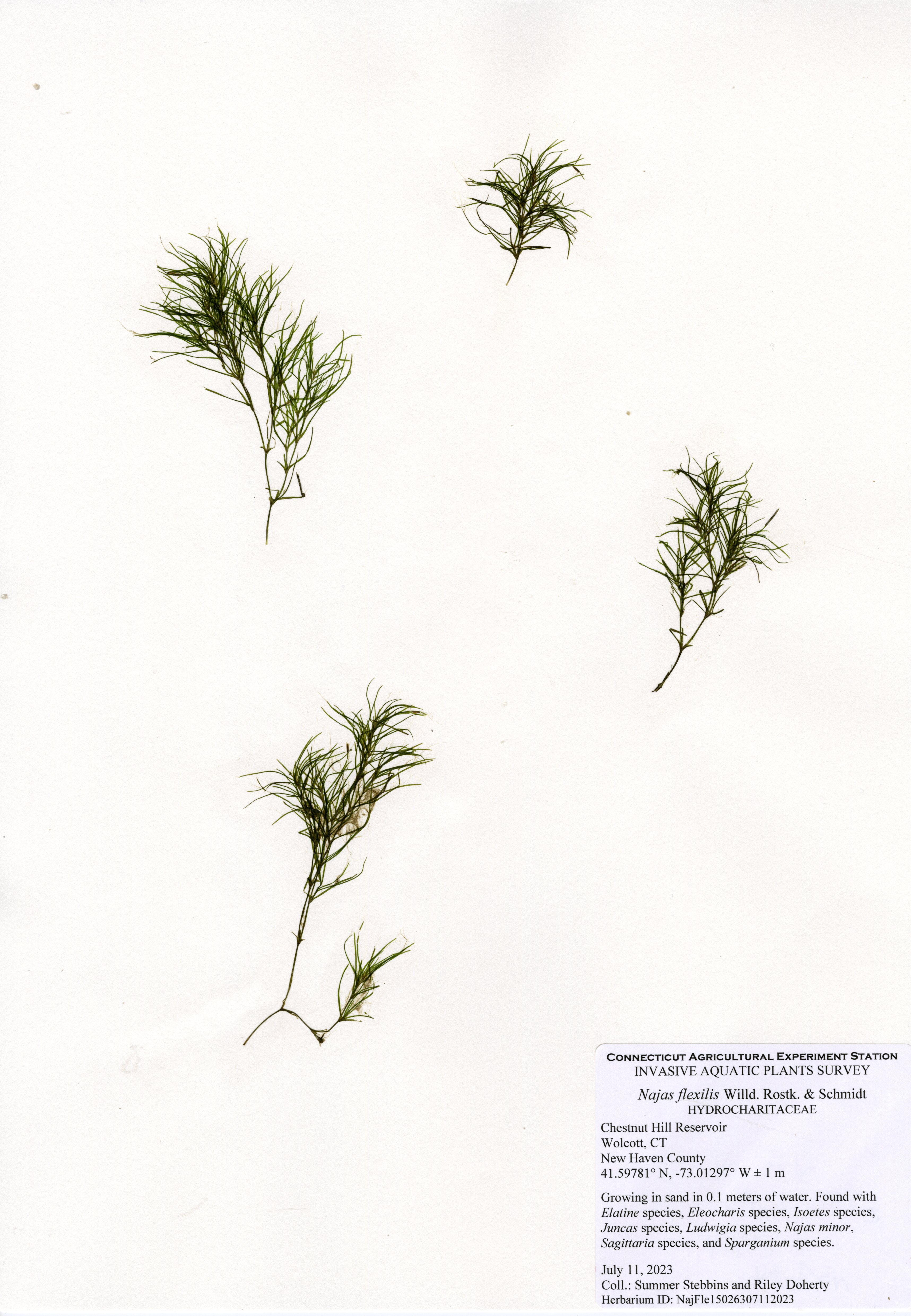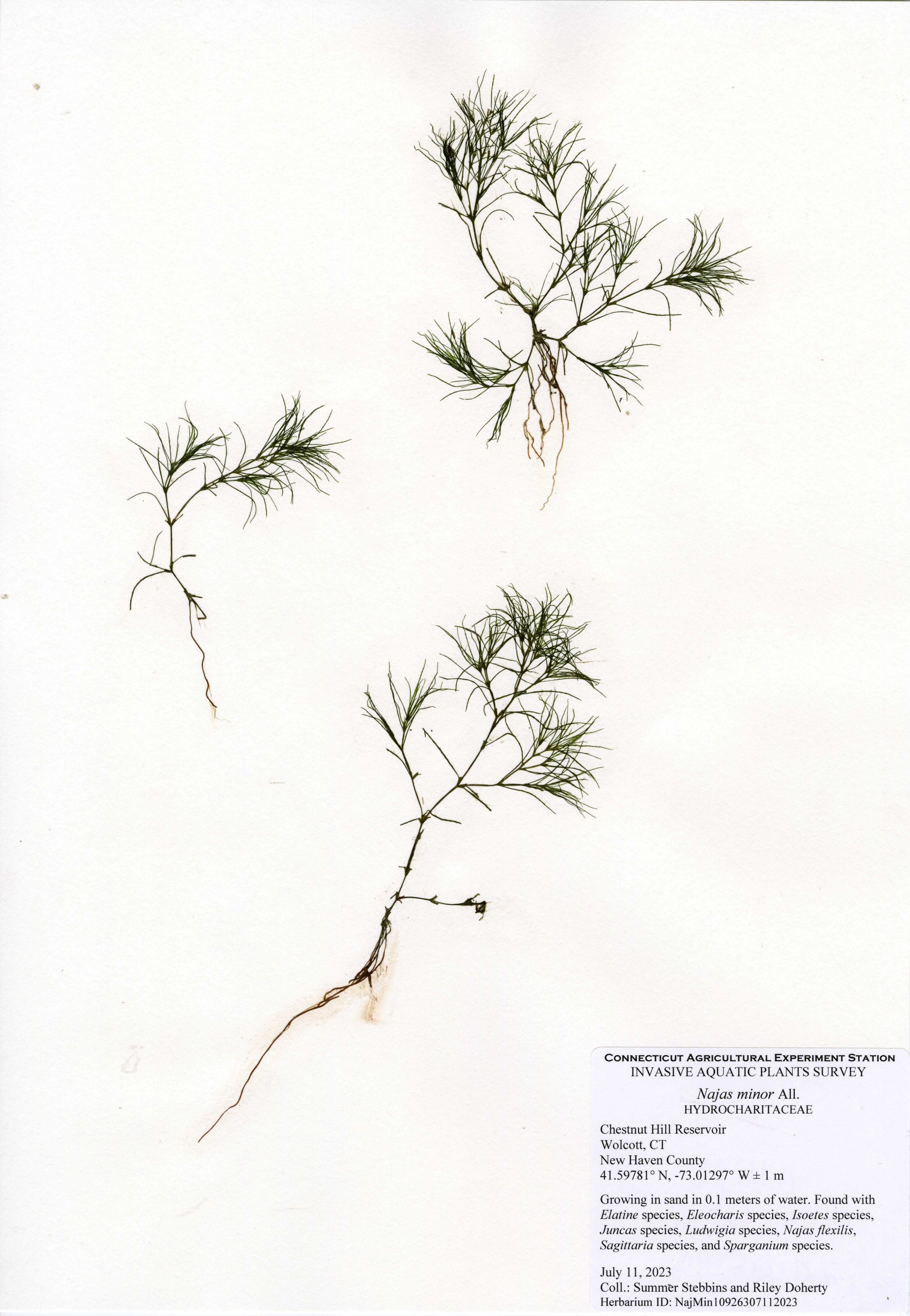 CAES OAIS performed the first aquatic plant survey of the reservoir in July of 2023. A total of 17 plant species were mapped. Of these, three were invasive: minor naiad (Najas minor), phragmites (Phragmites australis), and purple loosestrife (Lythrum salicaria). Minor naiad is an annual, low-growing, invasive aquatic plant that is often found in the shallows. The largest populations of minor naiad were near transects 1, 3, and 5. Native slender naiad (Najas flexilis) can be commonly confused with minor naiad, and they were often found growing together in the reservoir. Minor naiad has highly curled, toothed, brittle leaves whereas slender naiad is often longer with smoother leaves that have no teeth. Phragmites and purple loosestrife are invasive wetland plants found on the shoreline. Phragmites was found frequently along the northern shoreline of the reservoir with one small patch on the southern shoreline. Purple loosestrife was found in one very small location on the southwestern shoreline along the road.
