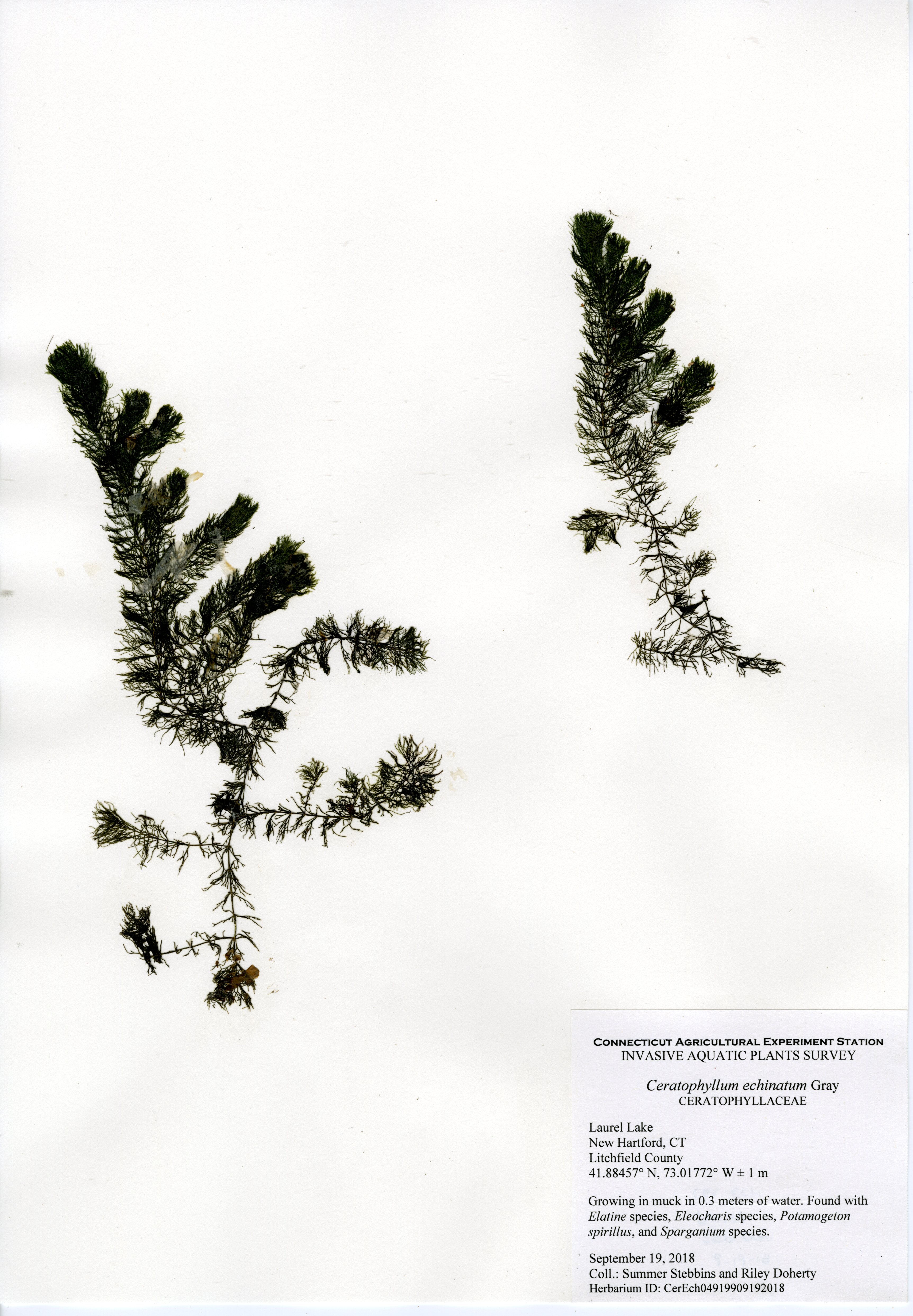 The CAES IAPP performed the third survey of the lake in 2018. The first survey was in 2012, the second in 2013. Compared to previous surveys, aquatic plant species were much less abundant. The same two invasive species were found, brittle waternymph (Najas minor) and phragmites (Phragmites australis), however less abundant. A new patch of phragmites was discovered near the dam at the northern end, and brittle waternymph was only found at the southern end of the lake.