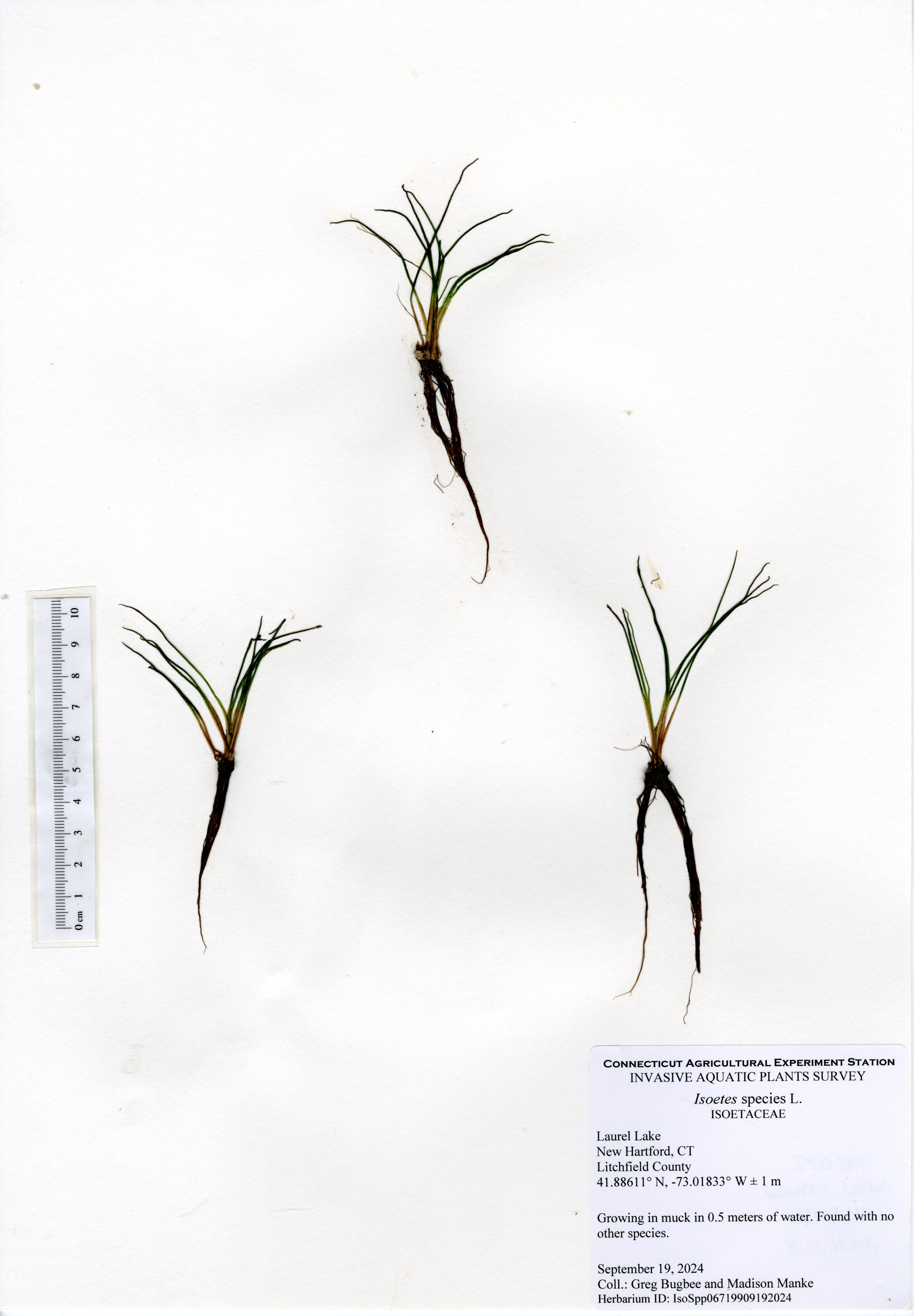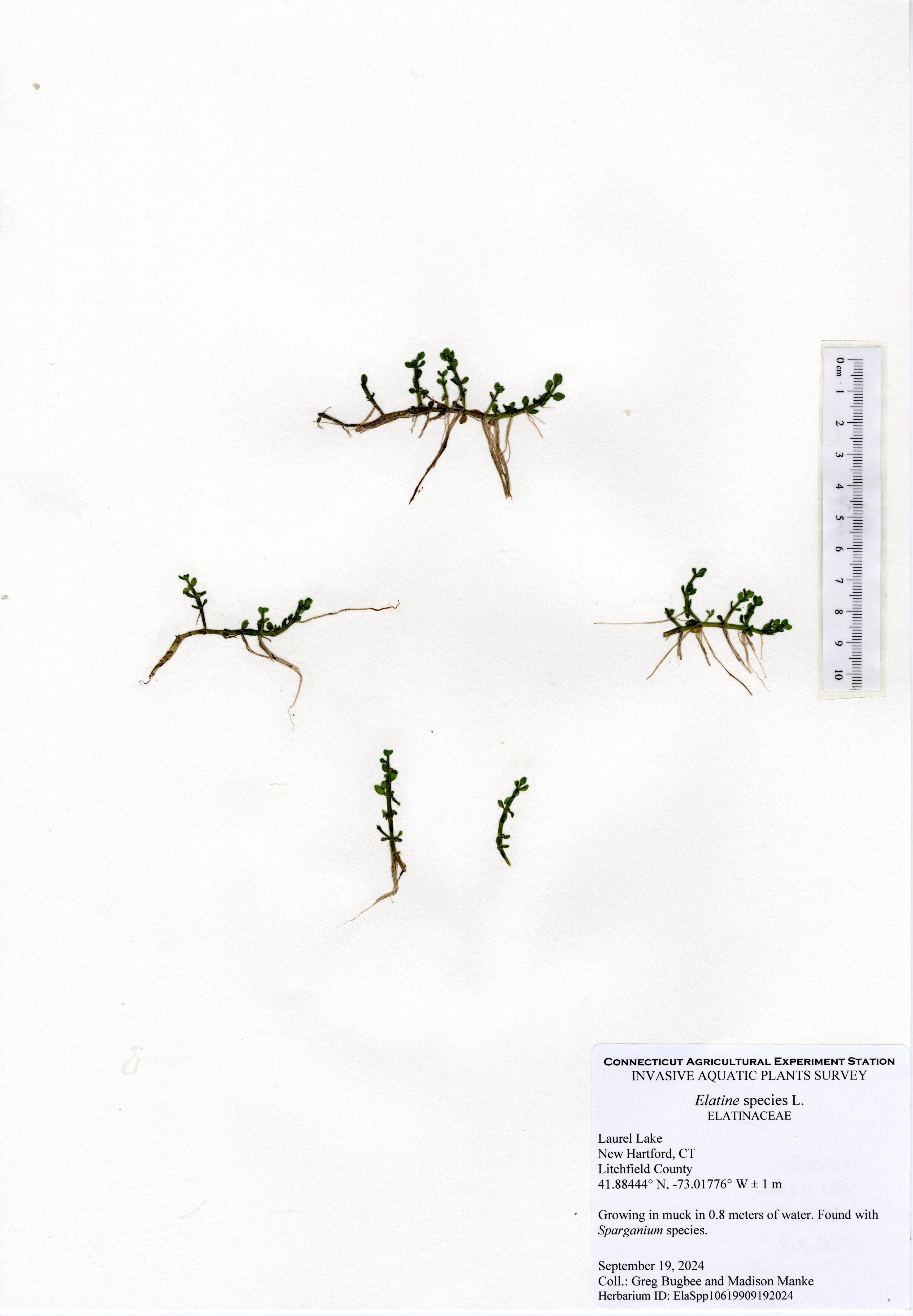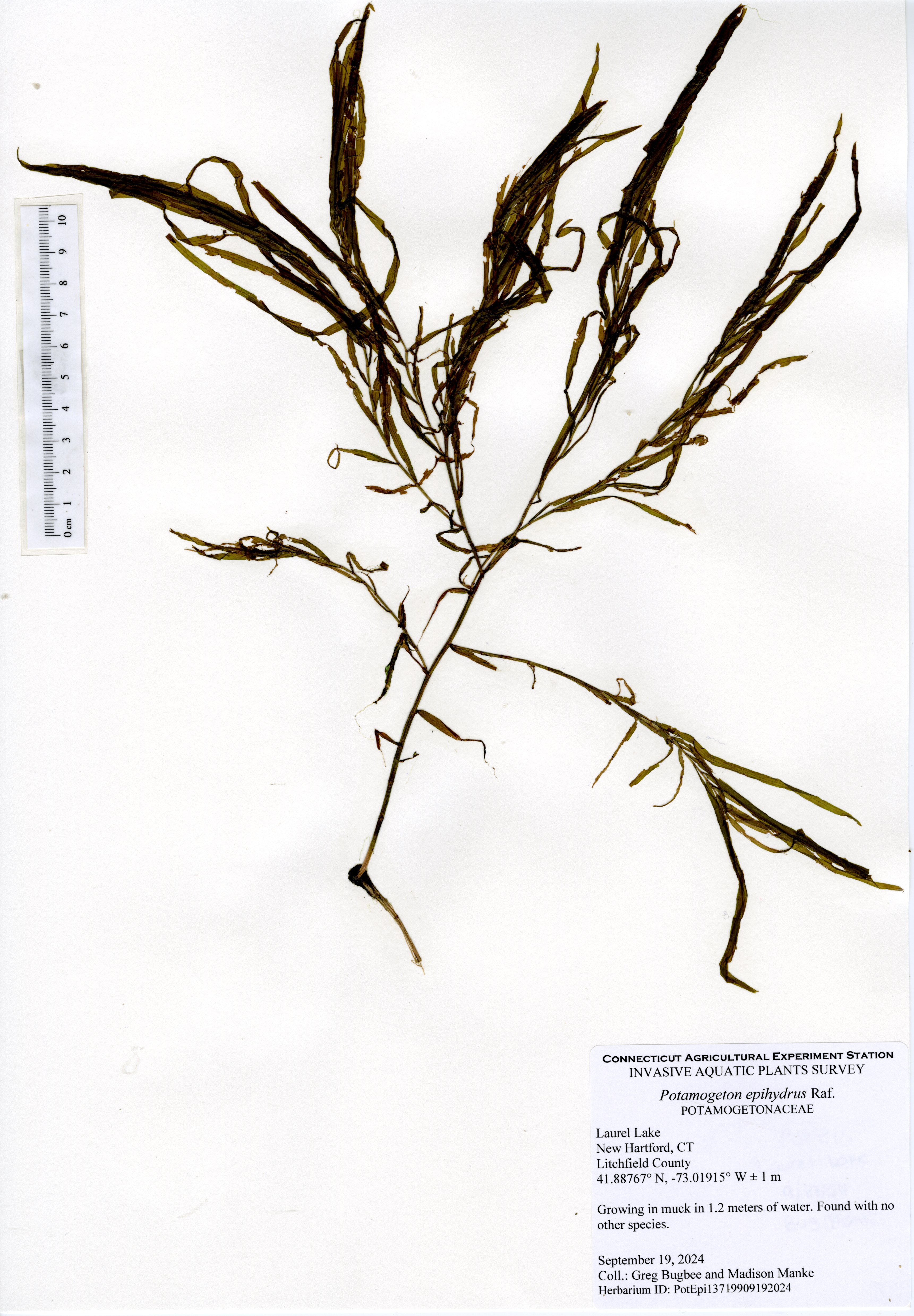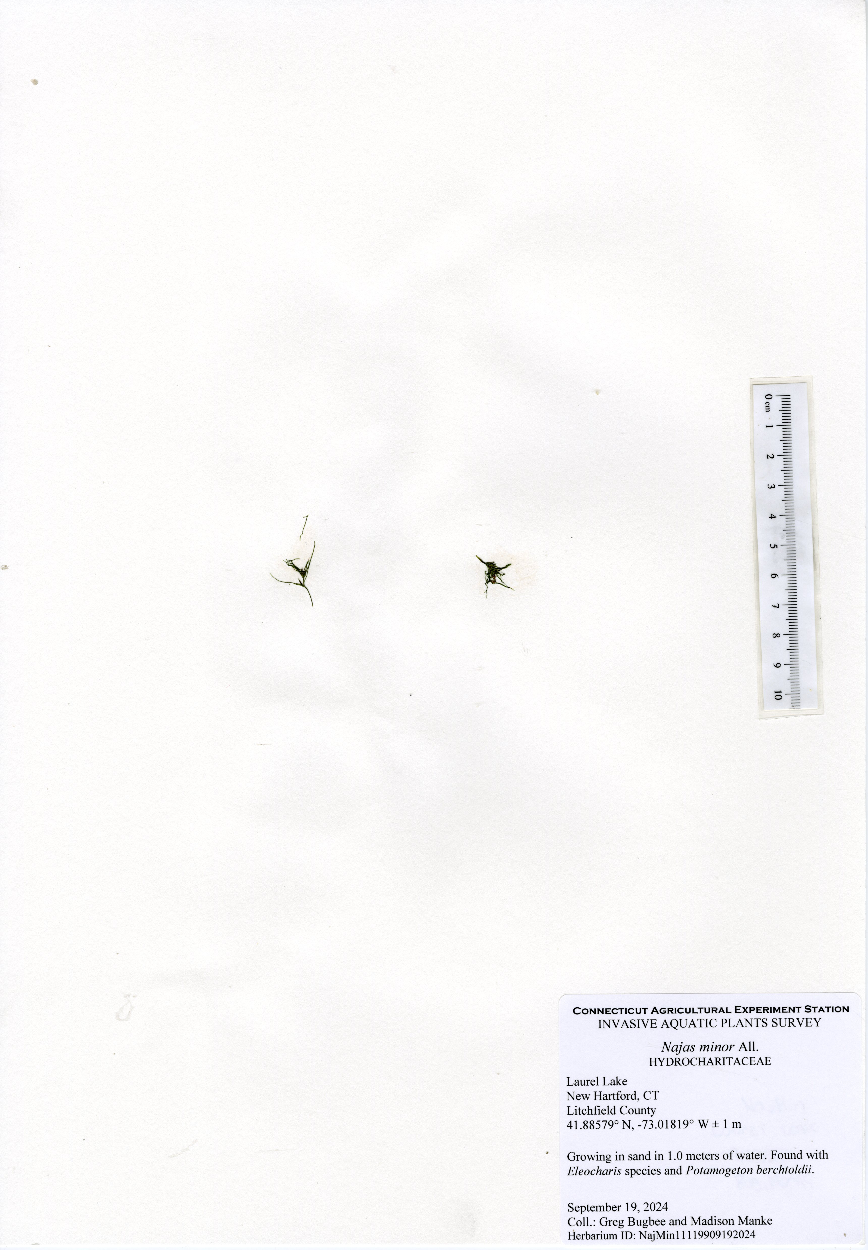 The 2024 aquatic plant survey was the sixth survey of Laurel Lake performed by the Connecticut Agricultural Experiment Station (CAES) Office of Aquatic Invasive Species (OAIS) since 2012. In 2024, we found 15 aquatic plant species including one invasive: minor naiad (Najas minor). Minor naiad is an annual that propagates from seed each year. There was less minor naiad found in 2024 compared to 2022, but it occurred in many of the same parts of the lake. The majority of minor naiad was found in the southern half of the lake, with a small population found in the very north end of the lake by the cattails. Two wetland species were also mapped: native cattail (Typha species) and invasive phragmites (Phragmites australis). The phragmites was found in the same spot as in 2022, by the western cove of the lake, and was roughly the same size.