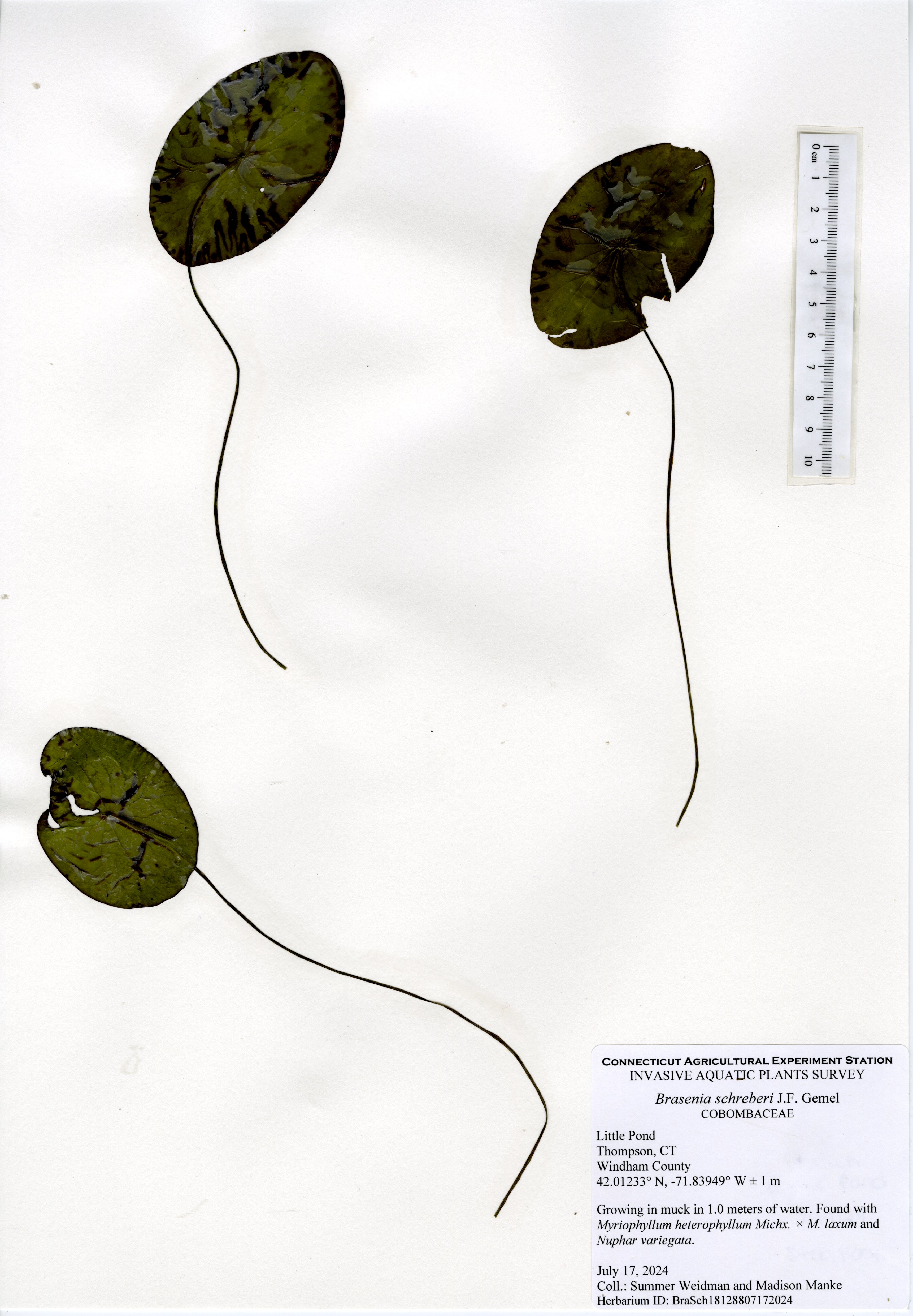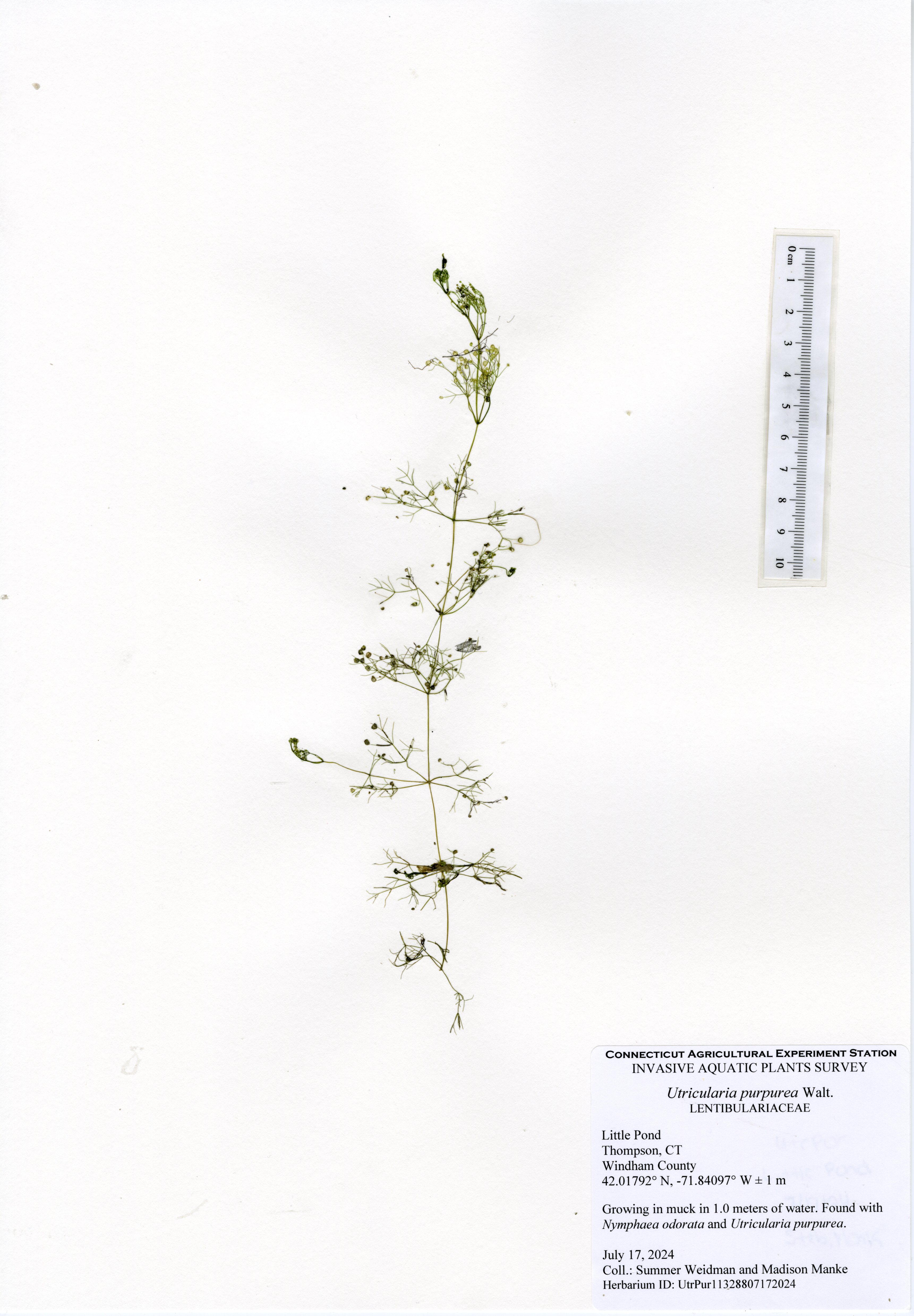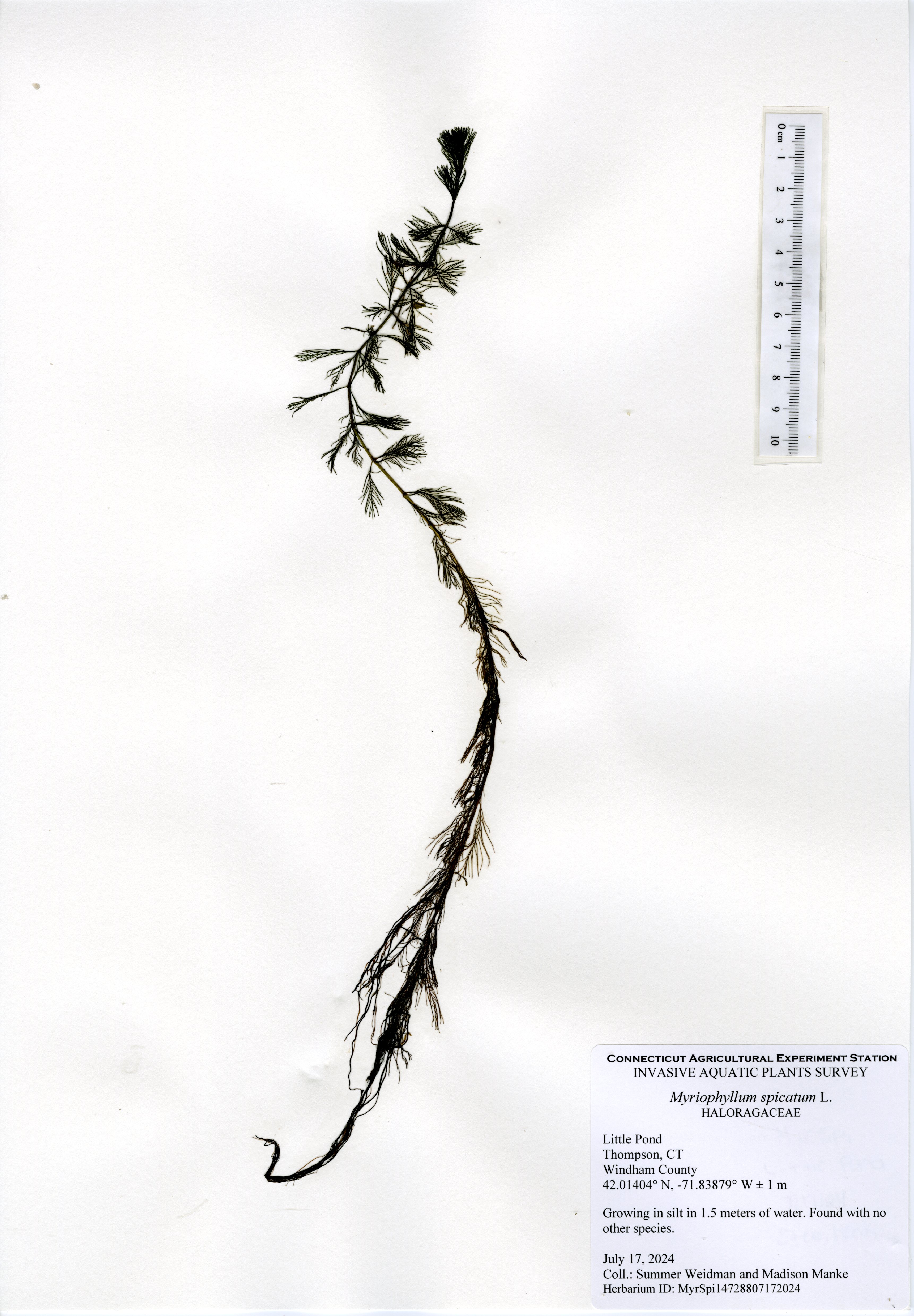 CAES OAIS conducted its first survey of Little Pond in July 2024. During the survey, 20 plant species were identified, including three invasive species. One invasive species, purple loosestrife (Lythrum salicaria), a wetland plant, was observed in small patches on the northwestern and eastern sides of the pond. The other two invasives, Eurasian watermilfoil (Myriophyllum spicatum) and a variable-leaf watermilfoil hybrid (Myriophyllum heterophyllum ×laxum), were also documented. Eurasian watermilfoil was primarily concentrated on the eastern side, while variable-leaf watermilfoil was found in small patches scattered along the pond's edges.