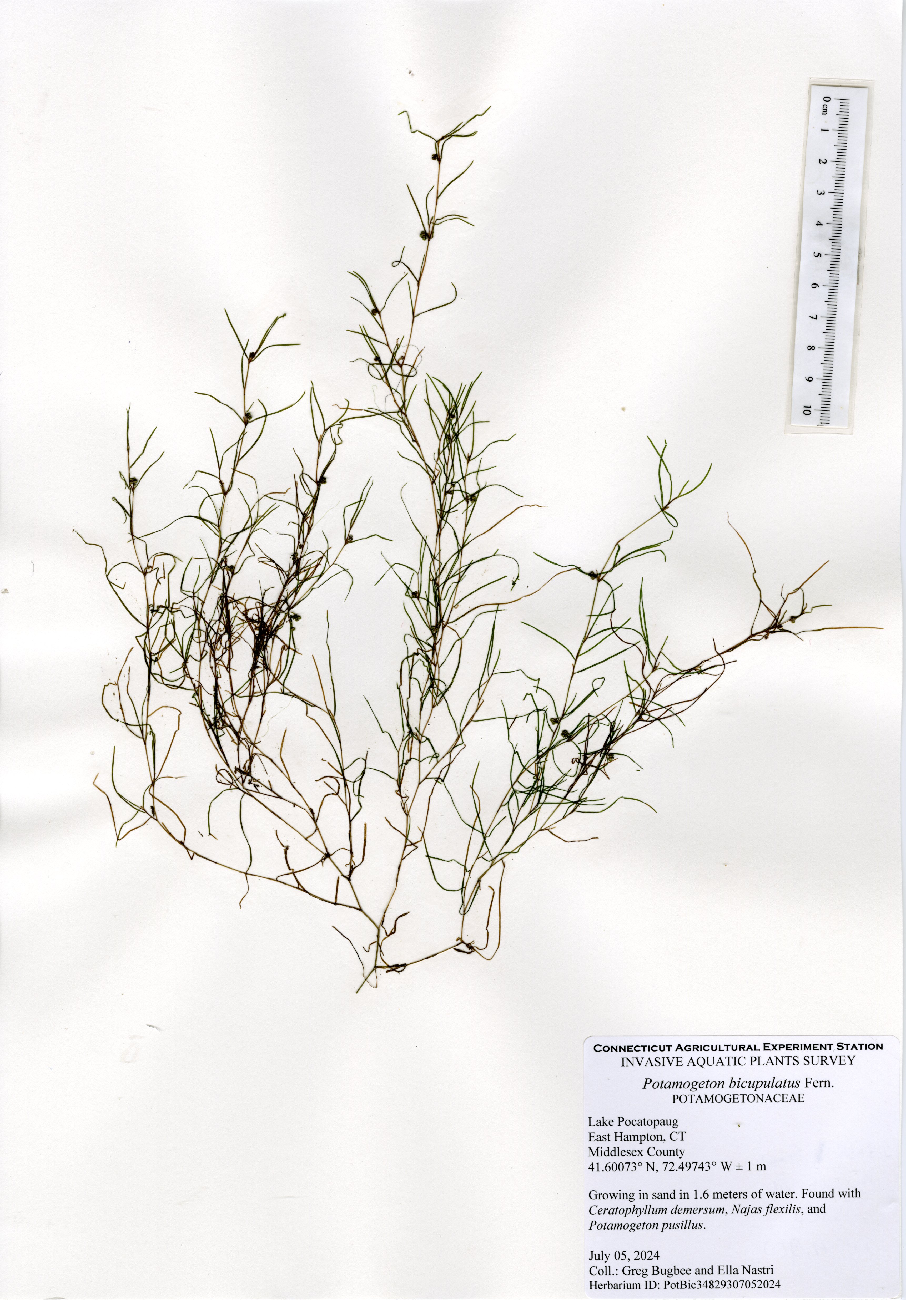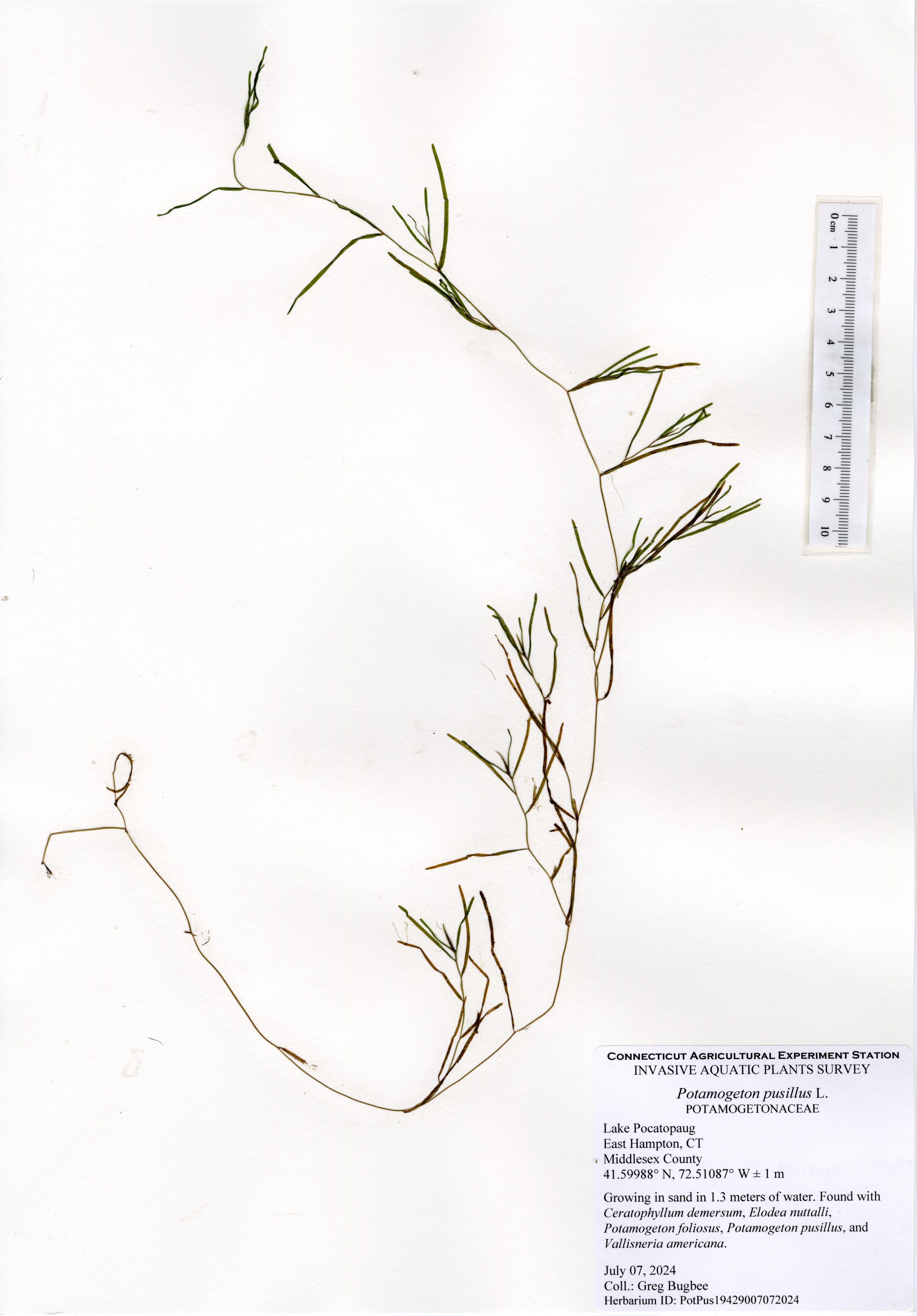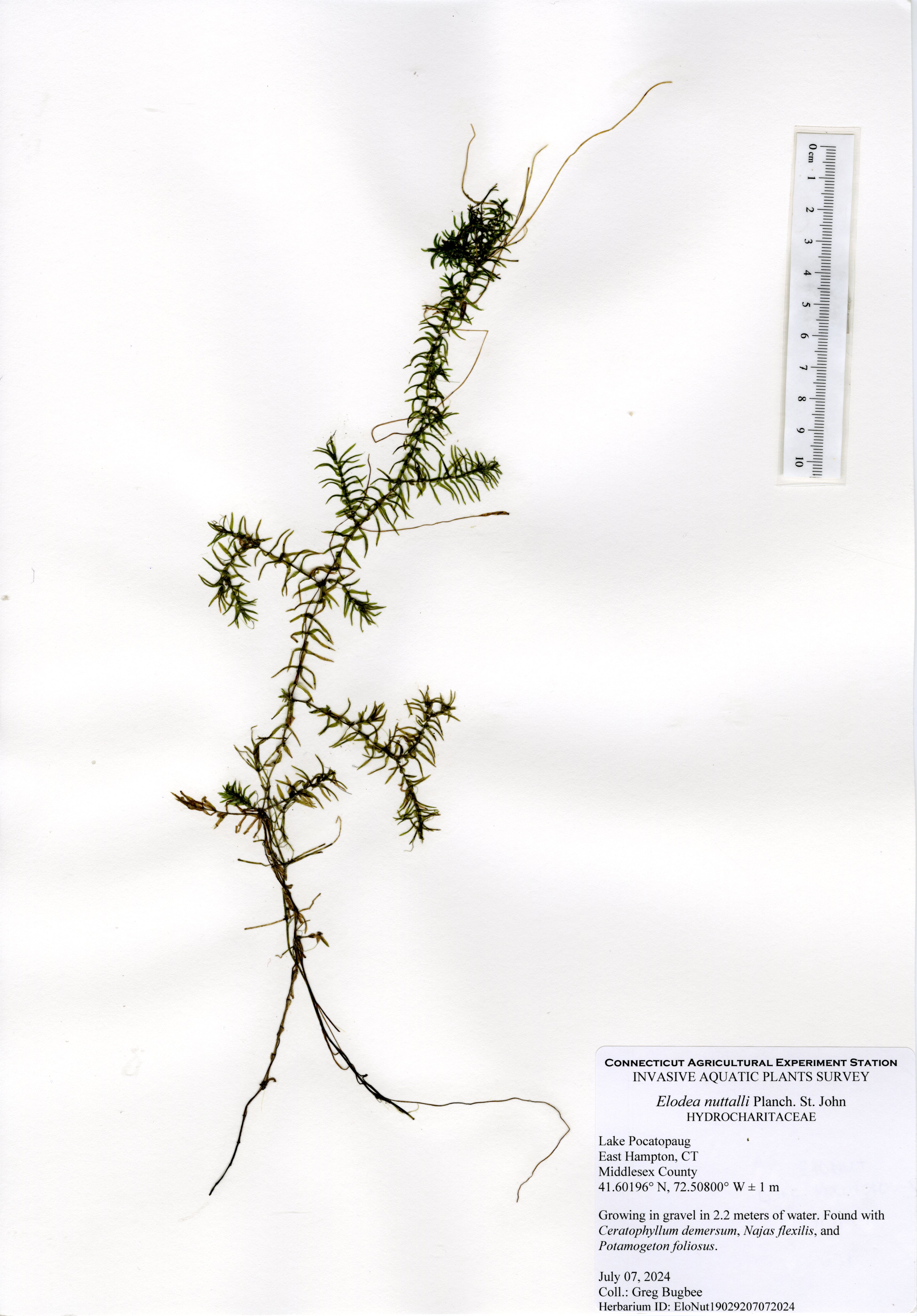 In 2024, water clarity was still limited with a green color to the water, but there was more aquatic vegetation present. Unfortunately, this also included the presence of a new invasive aquatic plant to the state, northern hydrilla (Hydrilla verticillata subsp. lithuanica). This plant, first established in the Connecticut River, has spread to at least ten other waterbodies throughout the state, including Lake Pocotopaug. Northern hydrilla was found throughout the northern and southern shorelines with some sparse populations along the western and eastern shorelines. The local stakeholders are actively working to keep the population under control.