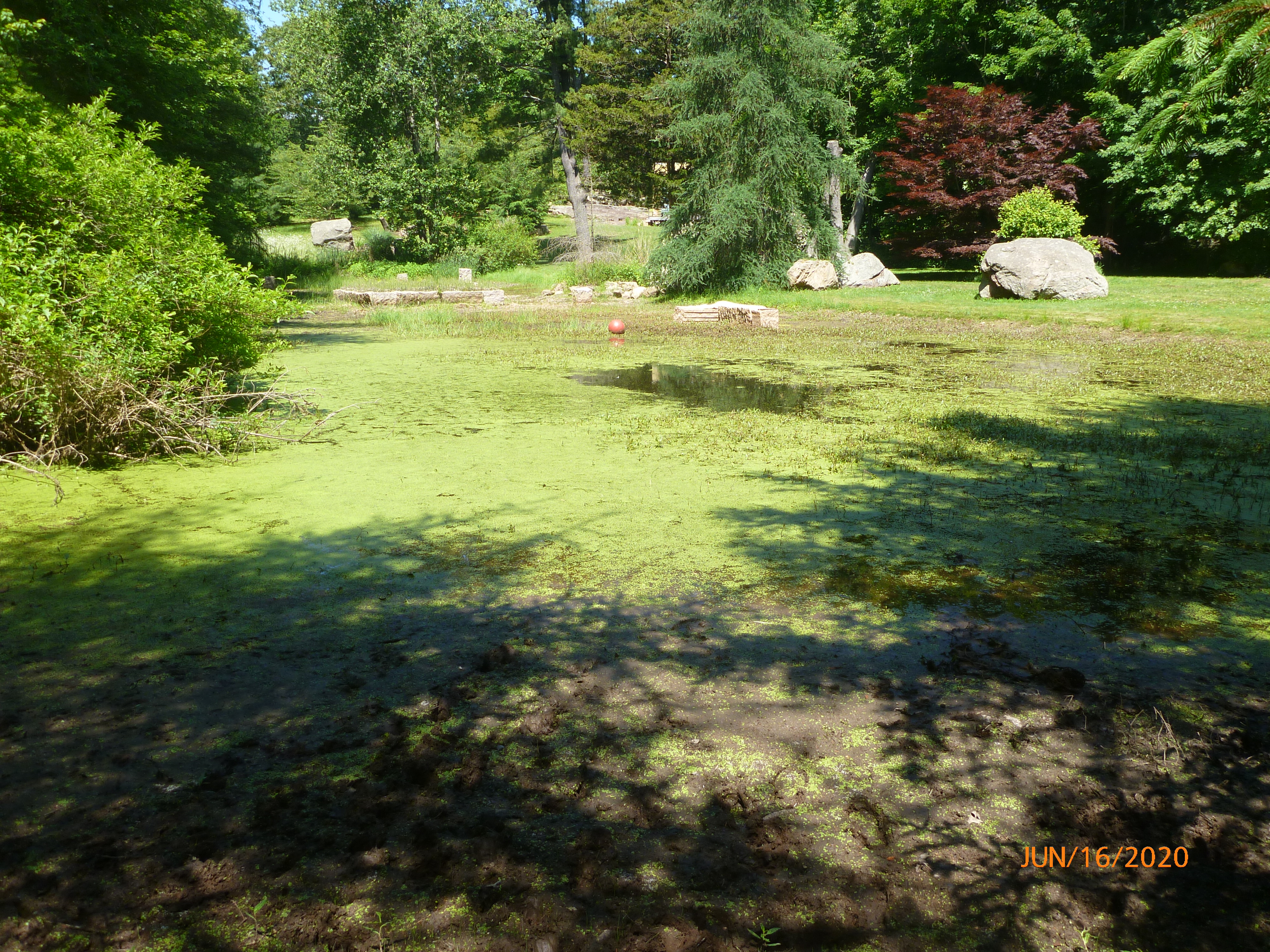 Vernal Pond is a small, 0.3-acre waterbody located in Guilford, CT. It is a private pond with no boat access. The pond is very shallow and partially dries up during the summer. The only three aquatic plant species found were cattail (Typha species), common duckweed (Lemna minor), and swamp loosestrife (Decodon verticillatus). All are native. The lack of aquatic species is unsurprising considering the shallowness of the pond, and it supports a healthy ecosystem of frogs, turtles, and other wildlife.