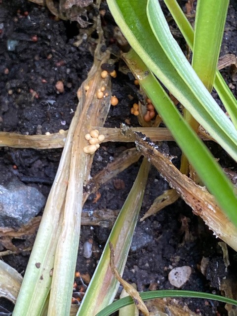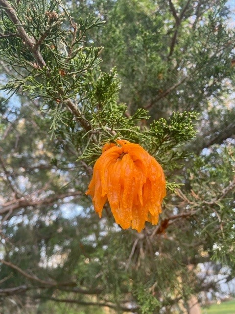 Wet spring weather can induce orange gelatinous horn-like structures to exude from galls on eastern red cedar and other junipers infected with cedar-apple rust. For more information, please refer to our fact sheet Cedar-Apple Rust.