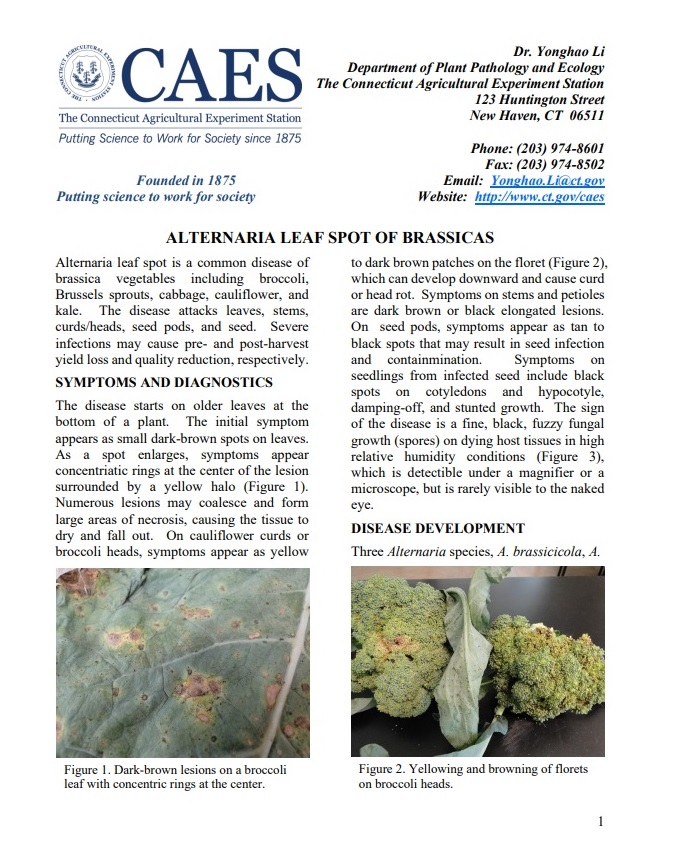 Alternaria leaf spot is a common disease of brassica vegetables including broccoli, Brussels sprouts, cabbage, cauliflower, and kale. The disease attacks leaves, stems, curds/heads, seed pods, and seed. Severe infections may cause pre- and post-harvest yield loss and quality reduction, respectively. Read more details in the linked fact sheet Alternaria Leaf Spot of Brassicas