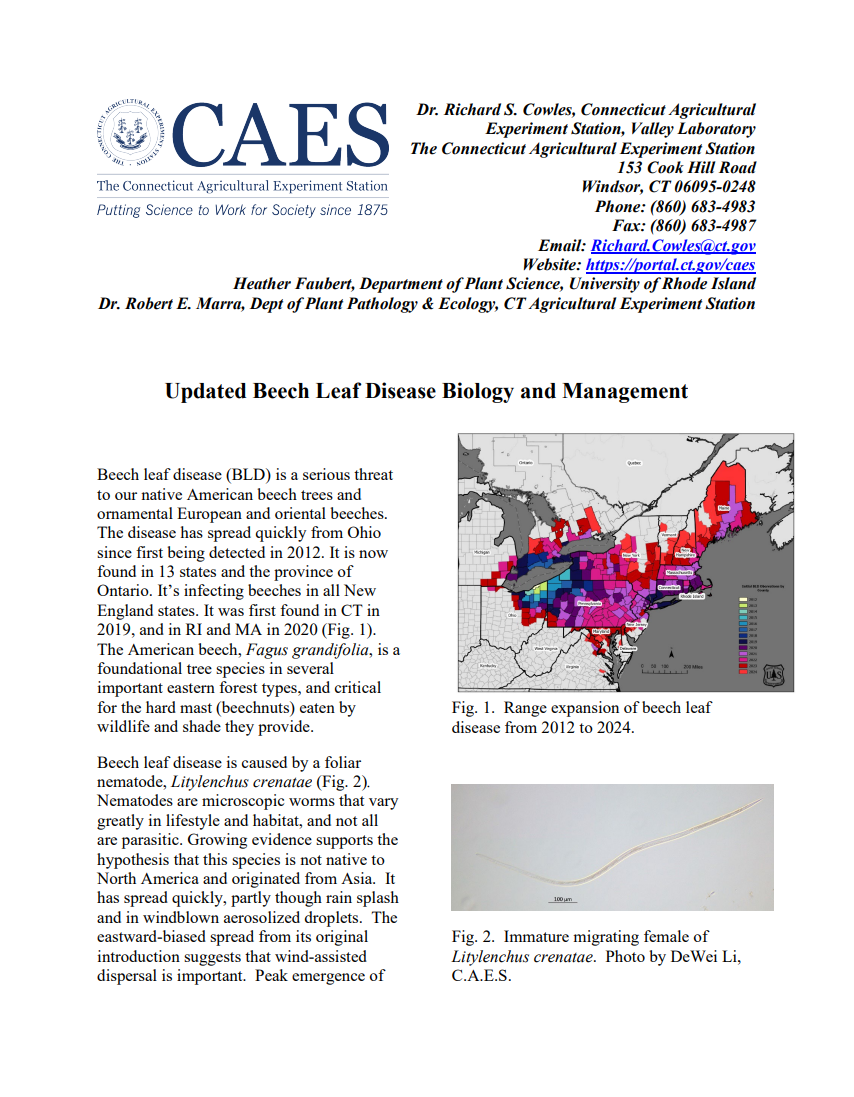 The Connecticut Agricultural Experiment Station (CAES) has released a new fact sheet providing an update and overview of current research on the biology and management of beech leaf disease (BLD), conducted by scientists at CAES and at research institutions throughout the affected region. Beech Leaf Disease: Management Options