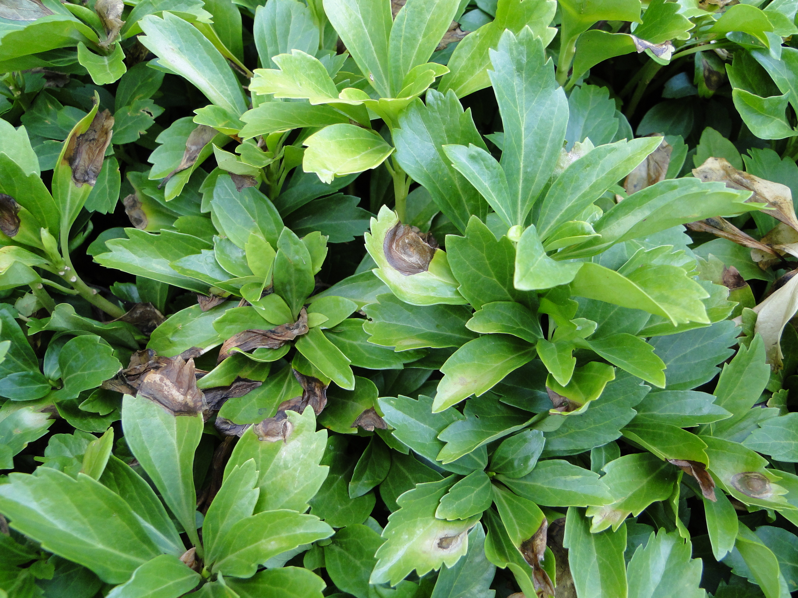 Volutella Blight was the subject of our What's New update in the spring of 2016 and 2017, and it looks like we will be having another spring with conditions favorable for the growth and spread of this pathogen. It is typical for pachysandra to appear yellowish in color following the winter, but if your pachysandra beds are looking sparse you should examine the plants for signs of Volutella Blight. Brown spots on leaves and black shriveled stems are characteristic of this disease. If you notice any of these symptoms in your pachysandra, please feel free to contact us  and submit samples for confirmation. Cultural control and fungicide applications can help manage this disease.