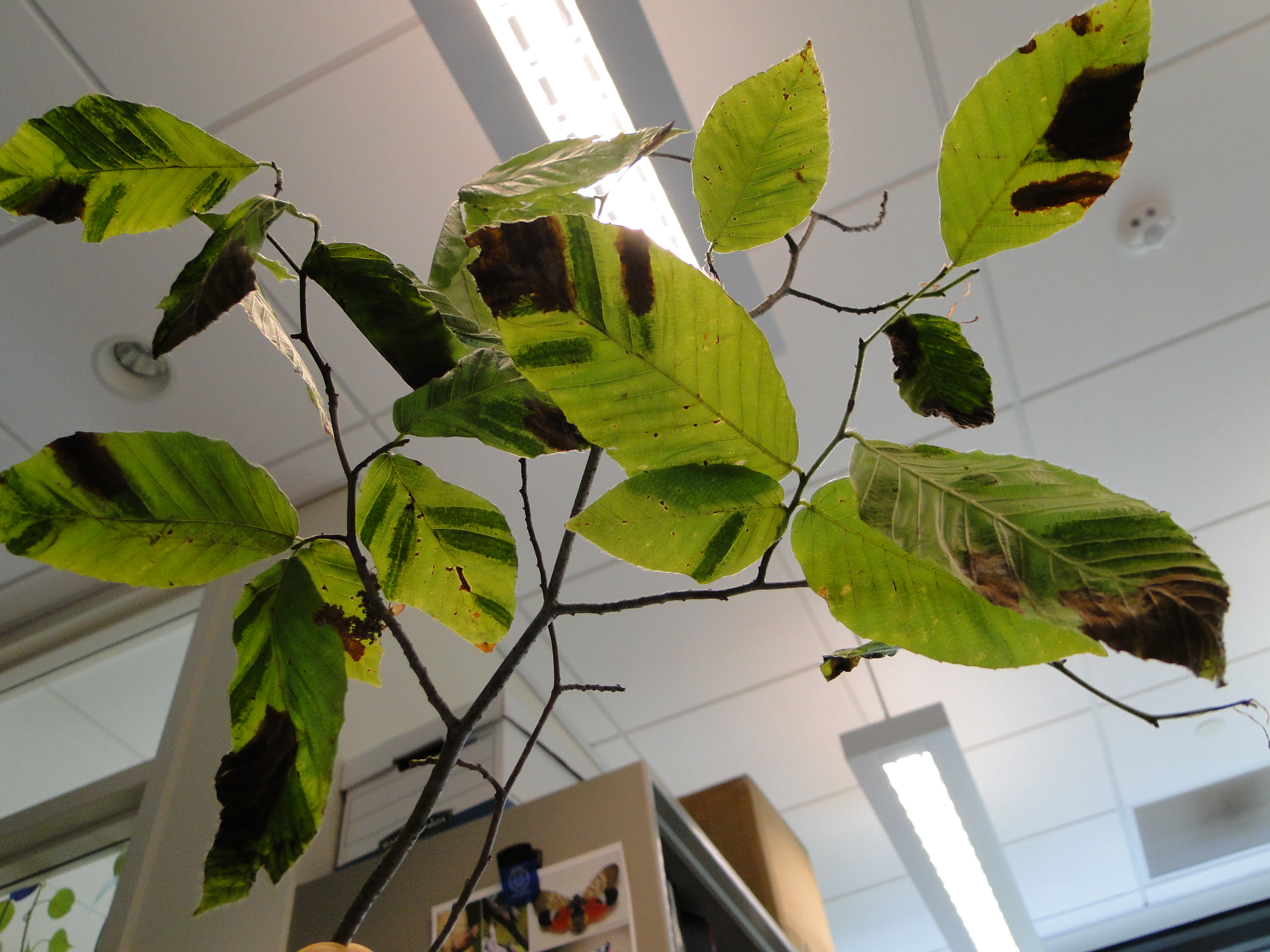 Oak wilt is an aggressive fungal disease which kills thousands of trees annually in the Midwest and Eastern United States. The disease is transmitted to healthy trees by nitidulid beetles which carry the fungal spores on them from infected trees. The disease can also be transmitted from a sick tree to a healthy tree via root systems that have grafted together. So far, oak wilt has not been detected in Connecticut, but the neighboring state of New York has found infected trees in four counties. Here is a link to the Department of Environmental Conservation's article on the recent findings: Deadly Oak Wilt Disease Found in Brooklyn and Several Towns in Suffolk County. The symptoms of oak wilt are most noticeable during the summer when leaf discoloration begins to occur. In red oaks, leaf death and defoliation occur rapidly whereas white oaks tend to die branch by branch over a longer period of time. For more information on this disease and what symptoms to look for, please read the USDA Forest Service brochure: How to Identify, Prevent, and Control Oak Wilt. If oak wilt is suspected on a tree here in Connecticut, branch samples with leaves displaying wilt can be submitted to the PDIO for analysis.
