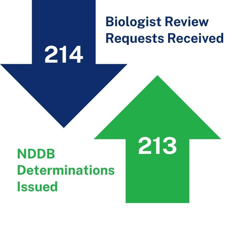 In Q1 2025, DEEP’s NDDB program received 348 requests. Many were related to aquatic invasive species treatment, which increases the baseline number of requests we usually receive in a quarter. DEEP provided 134 automated responses (i.e., response from the automated eNDDB portal indicating that there are no anticipated project impacts to rare species and therefore no further review is required), and 214 required further biologist review. DEEP issued a total of 213 biologist determinations this quarter.