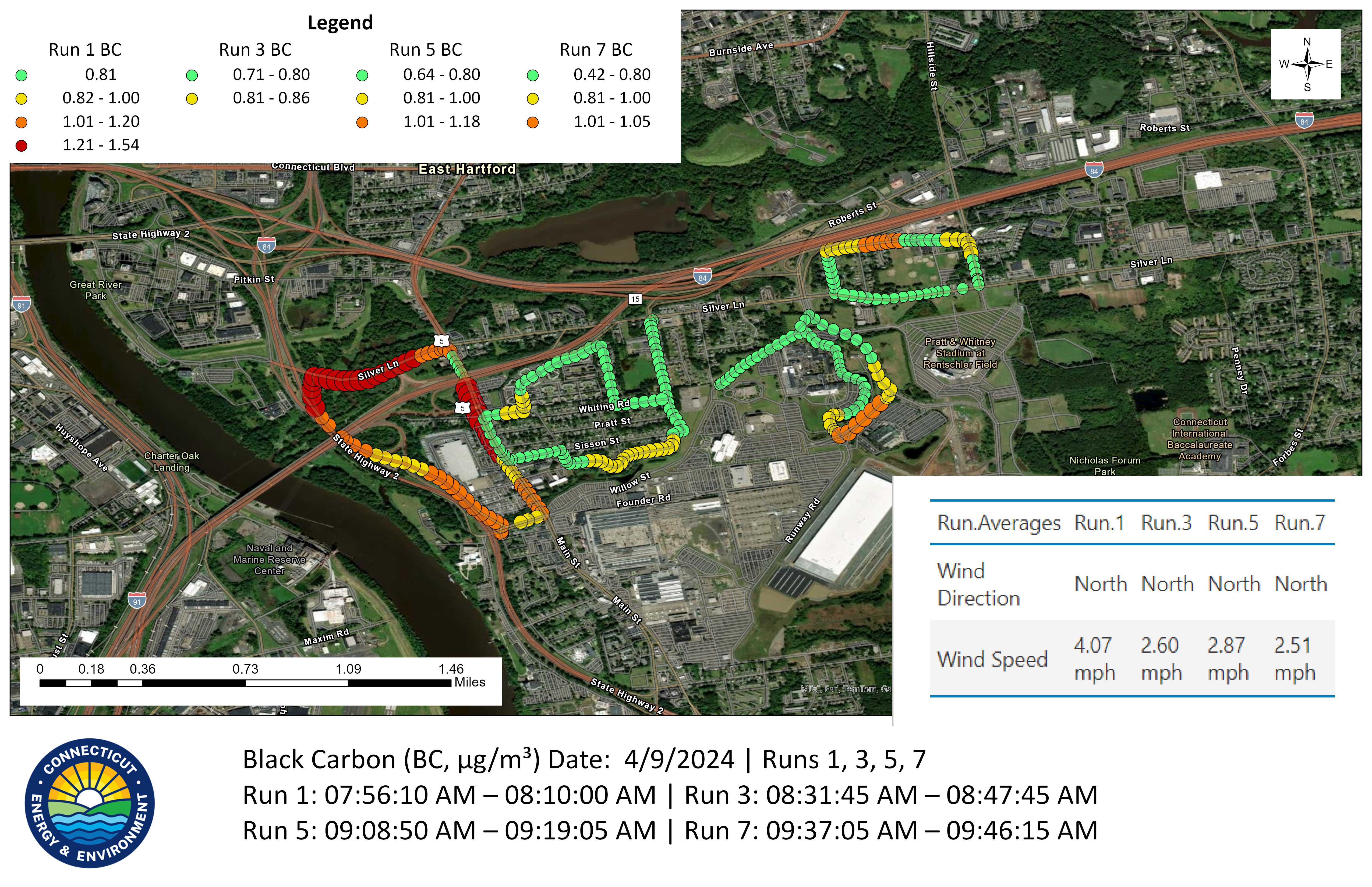 GMAP is a mobile air monitoring vehicle designed to measure the concentration of multiple air pollutants, many in real time. The vehicle is equipped with gas and particulate analyzers, various meteorological instruments, and high-precision GPS. These instruments are collectively referred to as GMAP, which stands for “geospatial measurement of air pollution,” and the data collected by the GMAP vehicle can be used to better understand local air quality. The GMAP vehicle provides the benefits of a “Next Generation Compliance” tool and further DEEP’s commitment to protecting air quality and public health and promoting environmental justice. GMAP data can be plotted on a map or over satellite imagery, as below.