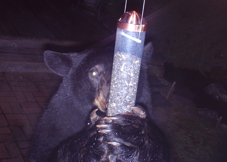 • Take down, clean, and put away bird feeders by mid-March, or even earlier during mild weather. Store the feeders until late fall and clean up spilled seed from the ground. Store any unused bird seed and suet in a location not accessible to bears, such as a closed garage. Do not store bird seed in screened porches or sheds where bears will be able to rip screens or break through windows to access the seed.