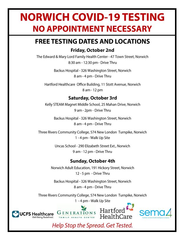 In addition to these locations, Hartford Health Care has is also setting up a pop-up COVID-19 testing location at its facility located at 11 Stott Avenue, Norwich CT from 8:00 a.m. until 12:00 p.m. tomorrow, Friday October 2, 2020.  For more information or any questions, reach out to the Uncas Health District at 860-823-1189 or by email to doh@uncashd.org