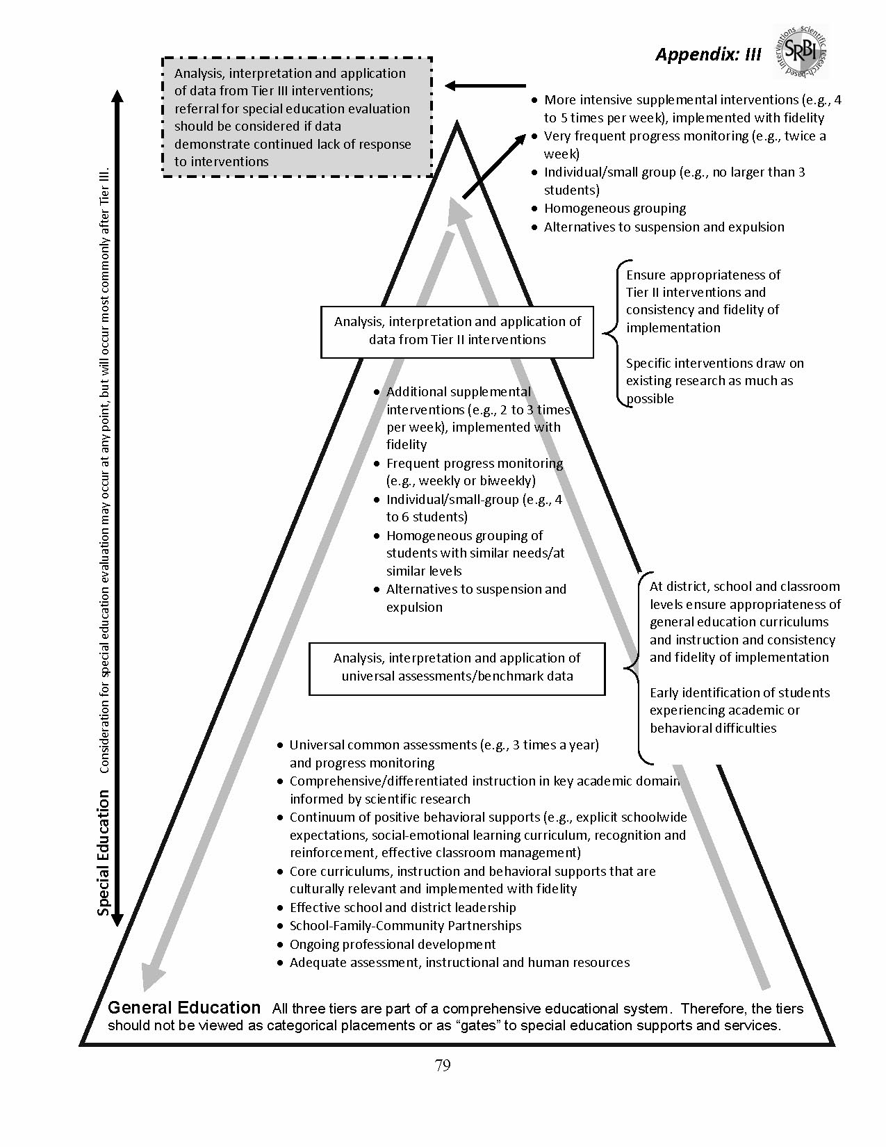A tiered intervention system, as defined in the SRBI framework, when implemented with fidelity, will provide a problem-solving model designed to produce improved outcomes for all students. Moreover, it is consistent with federal legislation IDEA 2004 and the No Child Left Behind Act of 2001 (NCLB) as well as scientific research and empirically supported prevention, and intervention strategies.