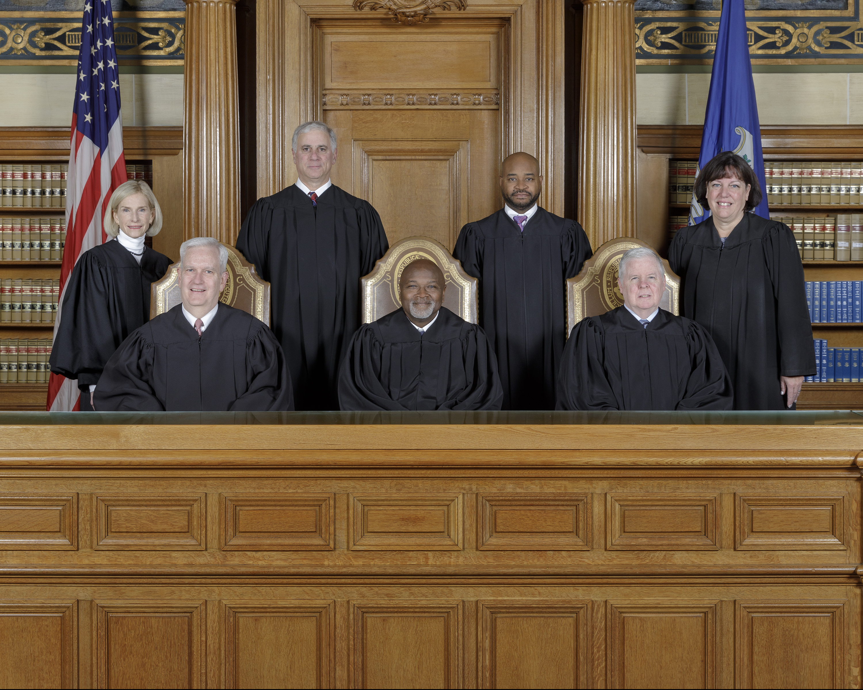 Standing from left to right: Justice Nora R. Dannehy, Justice Steven D. Ecker, Chief Justice Raheem L. Mullins, and Justice Joan K. Alexander; Seated from left to right: Justice Andrew J. McDonald, Chief Justice Richard A. Robinson (retired) and Justice Gregory T. D’Auria.