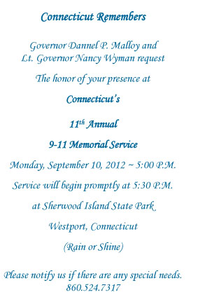Governor Dannel P. Malloy and Lieutenant Governor Nancy Wyman invite the public to attend the 11 th annual Connecticut Remembers September 11 th Memorial Service, to be held at Sherwood Island State Park in Westport on Monday, Sept. 10.
